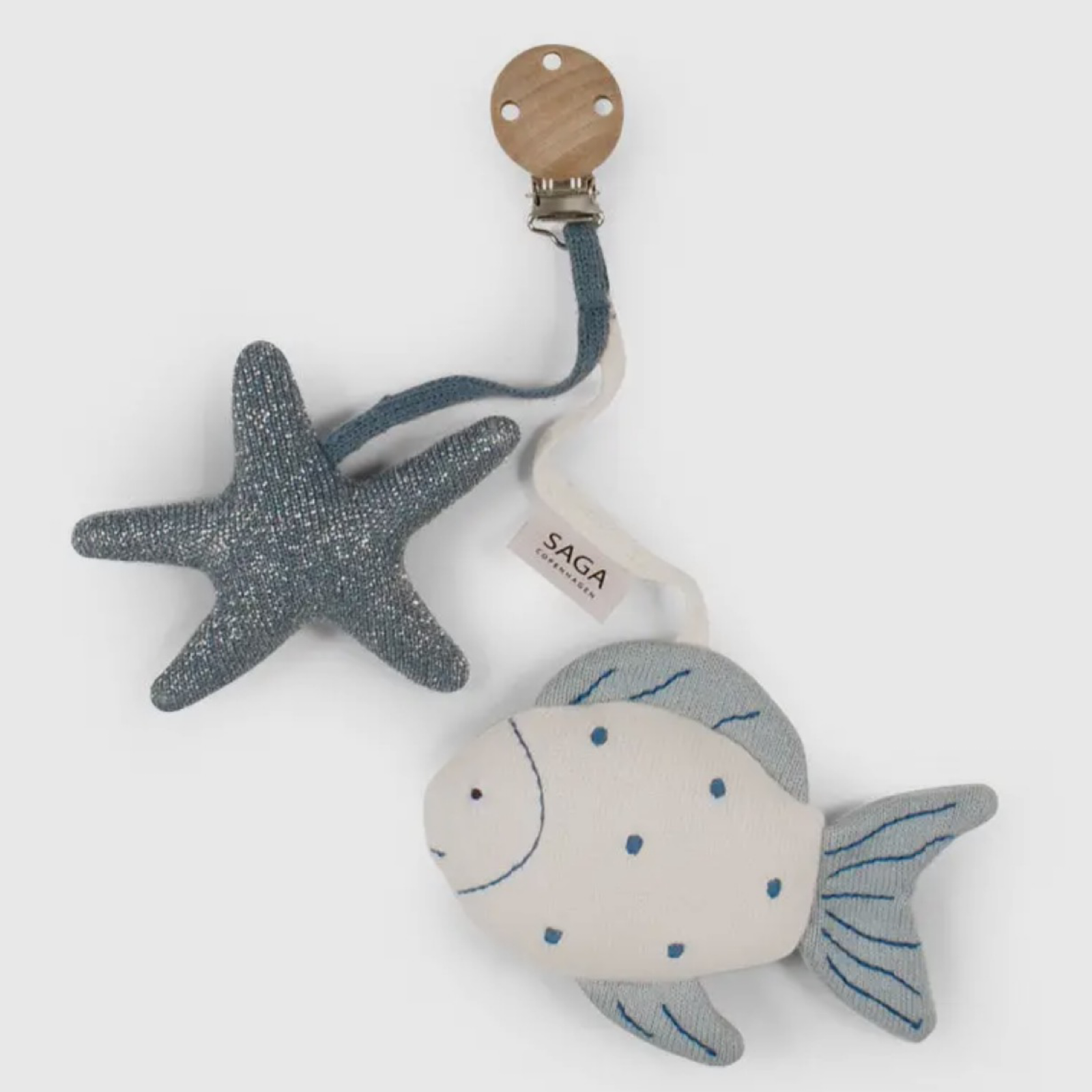 • Pupazzetto con pinzetta – Con simpatiche decorazioni marine, come un pesciolino e una stella, perfetto da appendere alla carrozzina per intrattenere il bambino.