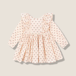 Un abito in 100% cotone organico con una raffinata stampa esclusiva ciliegie. Le ruches sulle spalle e i fiocchi sul retro aggiungono dettagli ricercati che lo rendono unico. Elegante, comodo e versatile, accompagna la tua