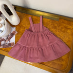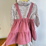 Un abito versatile e raffinato in microvelluto di cotone, morbido e confortevole. La gonna ampia dona un effetto voluminoso, mentre i bottoncini sulle bretelle permettono di incrociarle sul retro, aggiungendo praticità e un dettaglio elegante. Il colore rosa malva lo rende facile da abbinare, trasformandolo in un capo indispensabile e senza tempo nel guardaroba dei più piccoli.