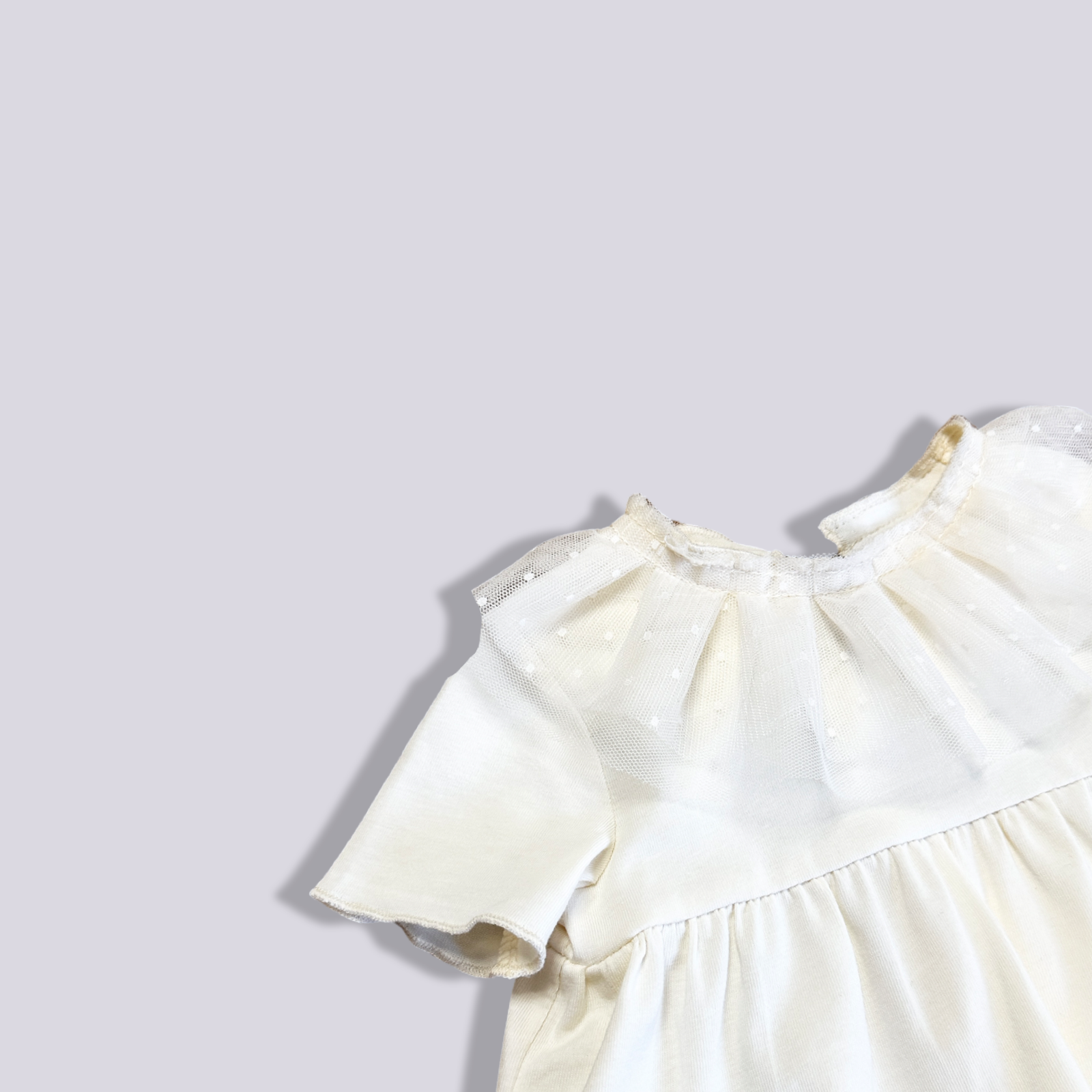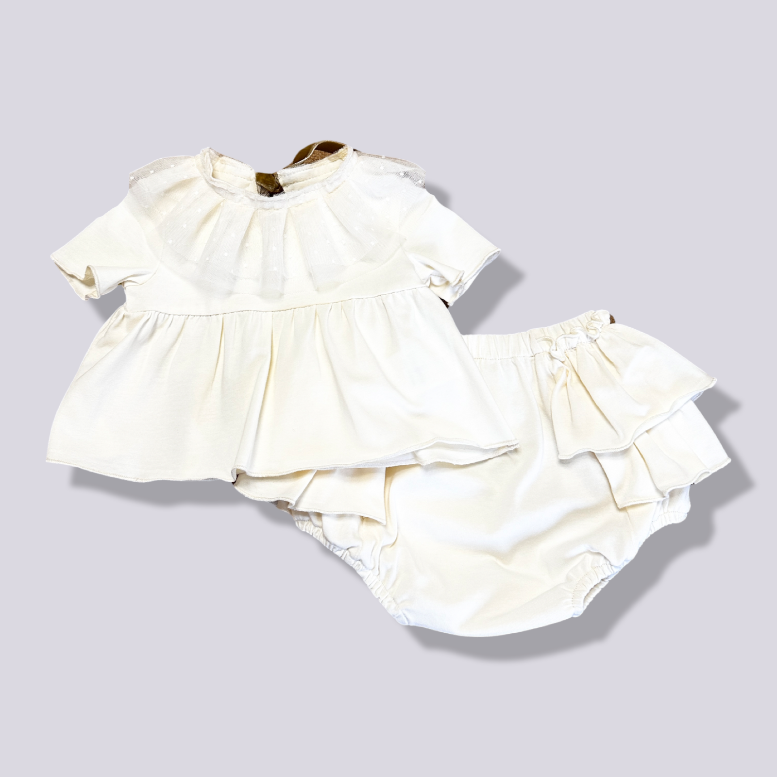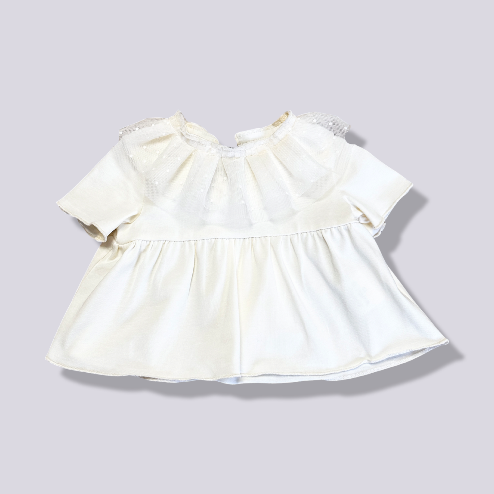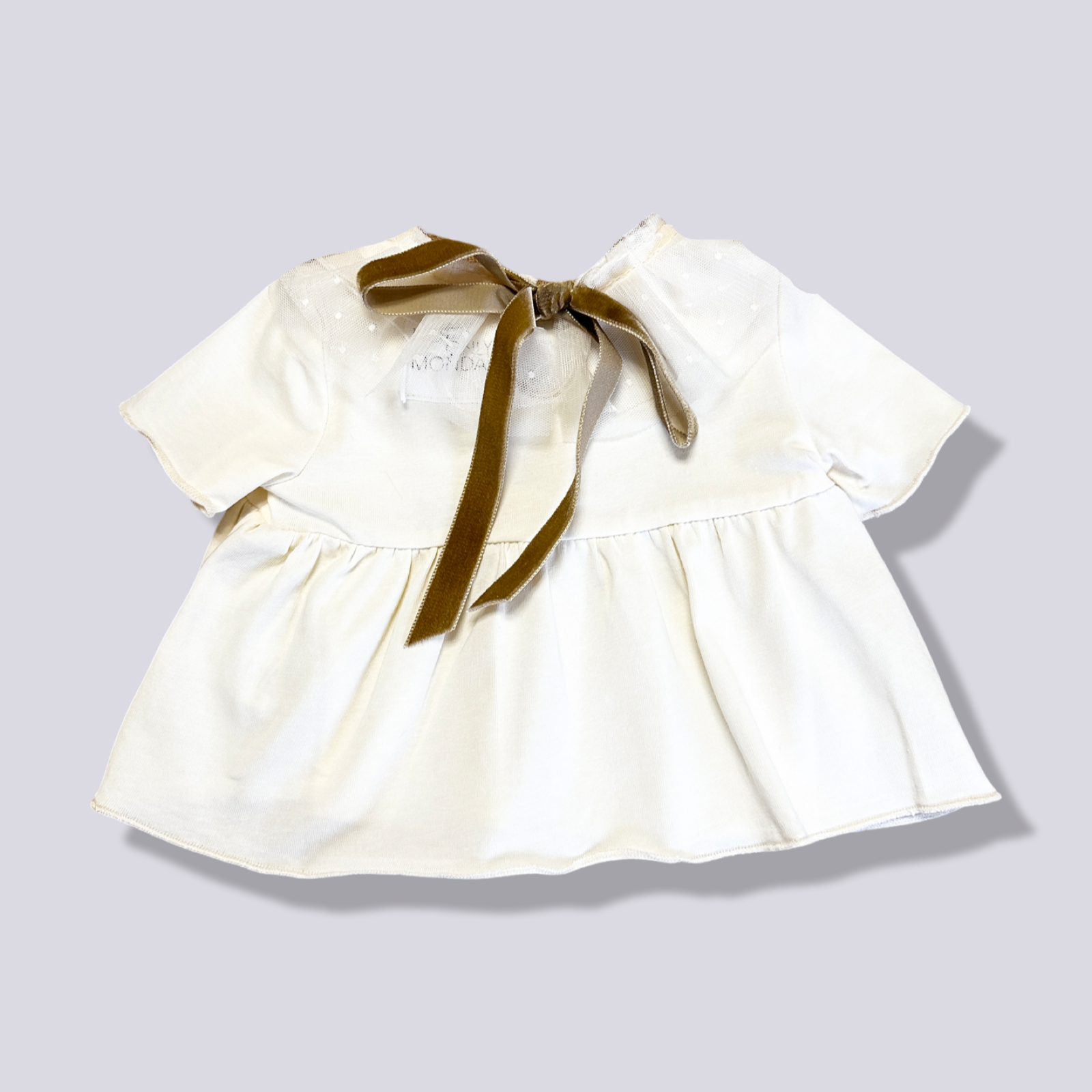 La blusa écru con il colletto in tulle per neonata è un capo dolcissimo e sofisticato, ideale per arricchire il guardaroba della piccola con un tocco di femminilità e raffinatezza. Il delicato colore écru offre una base neutra e versatile, facile da abbinare con altre tonalità, mentre il colletto in tulle aggiunge un elemento distintivo, giocando con la trasparenza e la texture per un effetto visivo unico e affascinante. Questo tipo di blusa è perfetto per occasioni speciali come cerimonie, festeggiamenti in famiglia o semplicemente per quei giorni in cui si desidera vestire la neonata in modo particolarmente carino. La morbidezza dei materiali utilizzati garantisce il massimo comfort sulla pelle delicata dei neonati, mentre il design pensato per i più piccoli assicura praticità nell'indossare e svestire