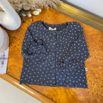 Una camicina in mussola di cotone antracite , che si distingue per il maxi colletto impreziosito da un delicato motivo di foglioline bianche a contrasto. Raffinata e versatile, è perfetta per tutte le stagioni e si abbina con facilità a qualsiasi look, donando un tocco di eleganza sobria e originale.