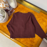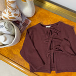 Cardigan in caldo cotone dal colore borgogna, con chiusura frontale tramite lacci che si trasformano in eleganti fiocchi.