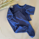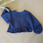 Cardigan in felpa tinto capo italiano, dal colore mirtillo intenso e raffinato. Il dettaglio della ruche sul retro aggiunge un tocco romantico, mentre la manica a palloncino dona volume ed eleganza. Un capo versatile e confortevole, perfetto per ogni occasione.