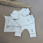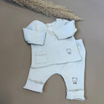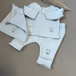 Completo in jersey di cotone grigio perla, composto da una maglia basica a manica lunga e ghettina senza piedini. Un set versatile e comodo, ideale per accompagnare il neonato nei primi mesi con morbidezza e libertà di movimento. In omaggio una bellissima sacca in cotone abbinata, perfetta per custodire accessori o ricordi speciali.