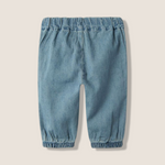 Pantalone in jeans in cotone biologico, con vita regolabile e coulisse, elastico alla caviglia e taglio jogger. Morbidissimo e versatile, pensato per il massimo comfort ogni giorno.