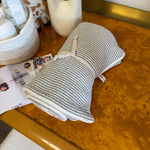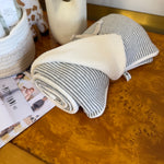 Coperta reversibile per neonato in caldo cotone mille righe cenere e latte da un lato e morbida spugna latte dall’altro.