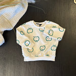 Questa felpa, dal tessuto morbido e confortevole, è decorata con un vivace motivo di mele verdi, che aggiunge un tocco di freschezza e originalità al guardaroba. Perfetta per i look casual, questa felpa è ideale per chi cerca comodità senza rinunciare a uno stile unico e distintivo. Un capo versatile, ideale per ogni occasione.