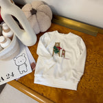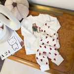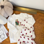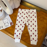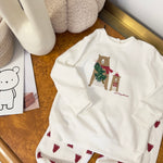 La maglia raffigura due teneri orsetti con il loro albero di Natale, mentre i pantaloni abbinati sono decorati da tanti piccoli alberelli festosi.