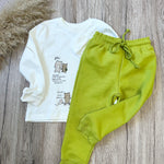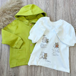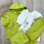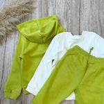 Composto da una felpa morbidissima con cappuccio e bottoni, una maglia a manica lunga e un pantalone coordinato, questo completo è ideale per accompagnare i bambini nelle giornate piene di impegni e movimento.