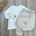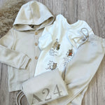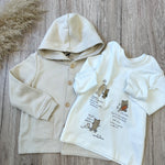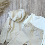 Composto da una felpa morbidissima con cappuccio e bottoni, una maglia a manica lunga e un pantalone coordinato, questo completo è ideale per accompagnare i bambini nelle giornate piene di impegni e movimento.