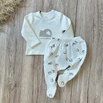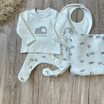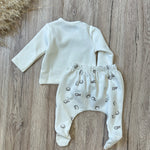 Un set dolcissimo pensato per i primi mesi, composto da ghettina con piedini e maglietta coordinata, entrambi in cotone morbidissimo e delicato sulla pelle.