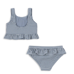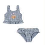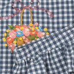 Un bikini che unisce raffinatezza e praticità, perfetto per le giornate di sole. Il classico motivo Vichy blu dona un tocco senza tempo, mentre le ruche sulla mutandina aggiungono dolcezza e movimento. Il top è impreziosito da un delicato disegno in paillettes con fiocco e vaso, per un dettaglio luminoso e ricercato.