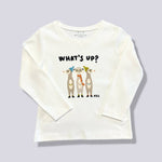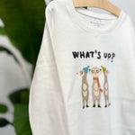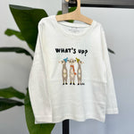 Questa simpatica t-shirt a maniche lunghe presenta tre adorabili suricati con cappellini colorati e la scritta "What's up?". Realizzata in cotone morbido e traspirante, è ideale per i piccoli esploratori che amano divertirsi e scoprire il mondo. Perfetta per un look casual e giocoso.
