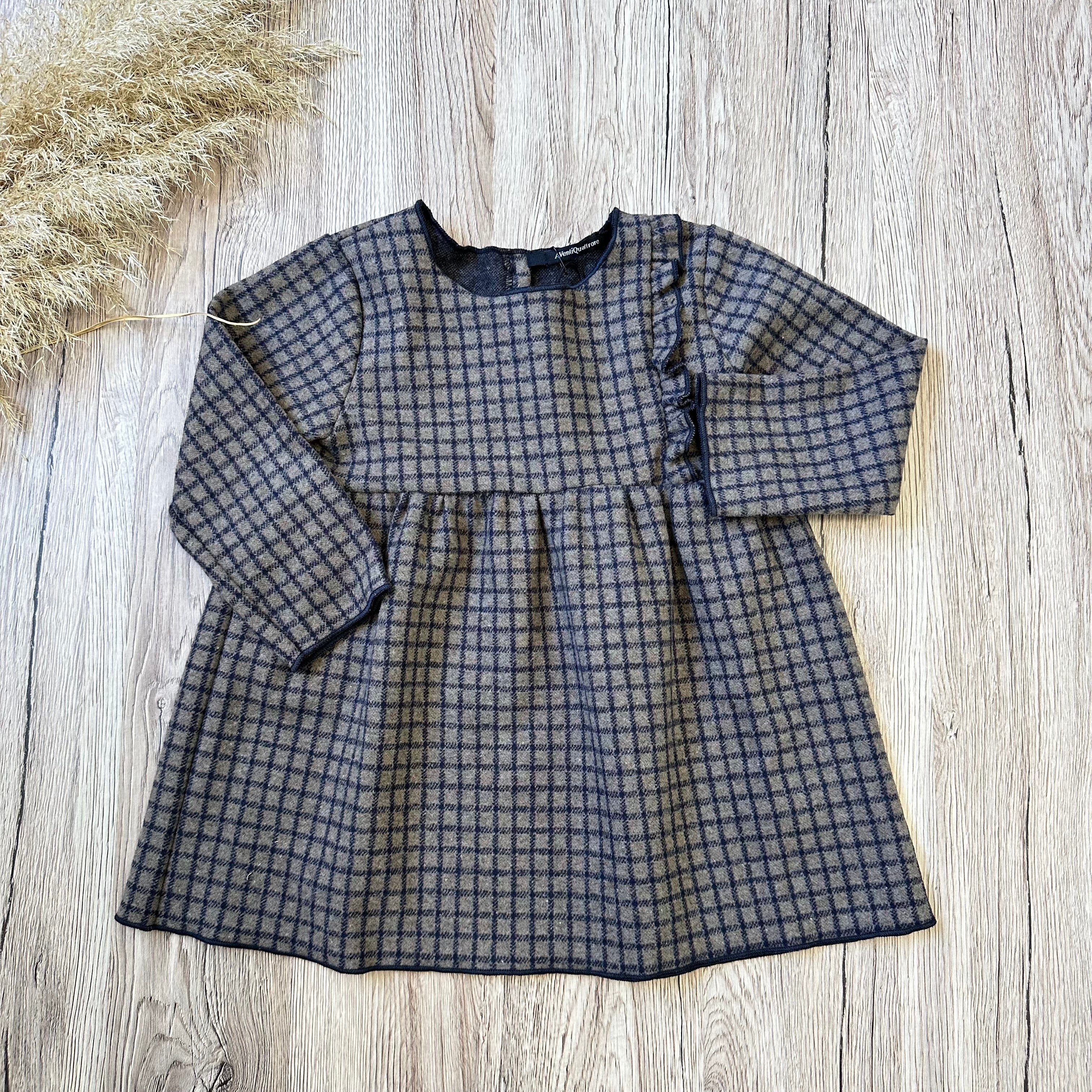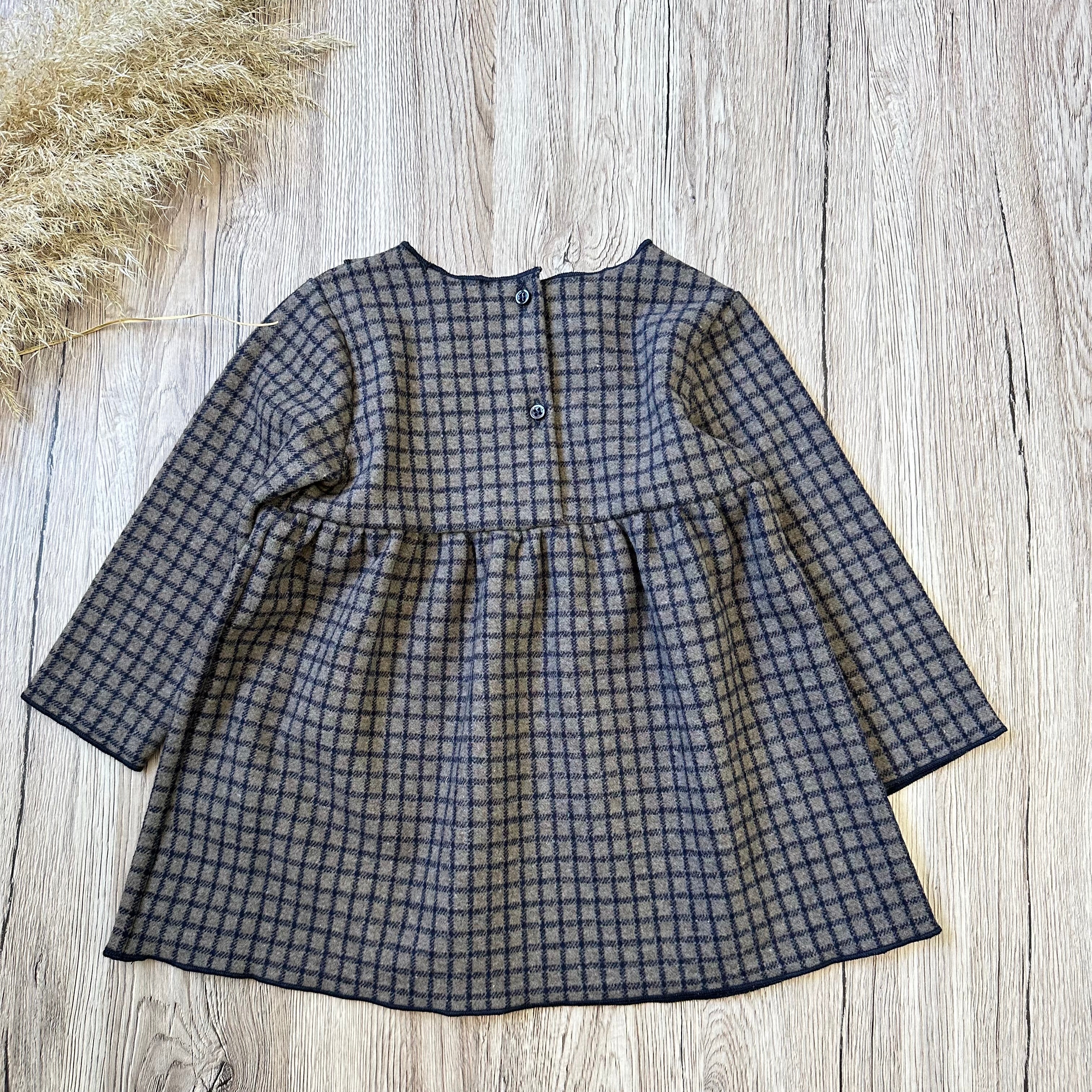 Abito a maniche lunghe in caldo cotone, con fantasia a quadretti su base color moro e righe sottili blu.