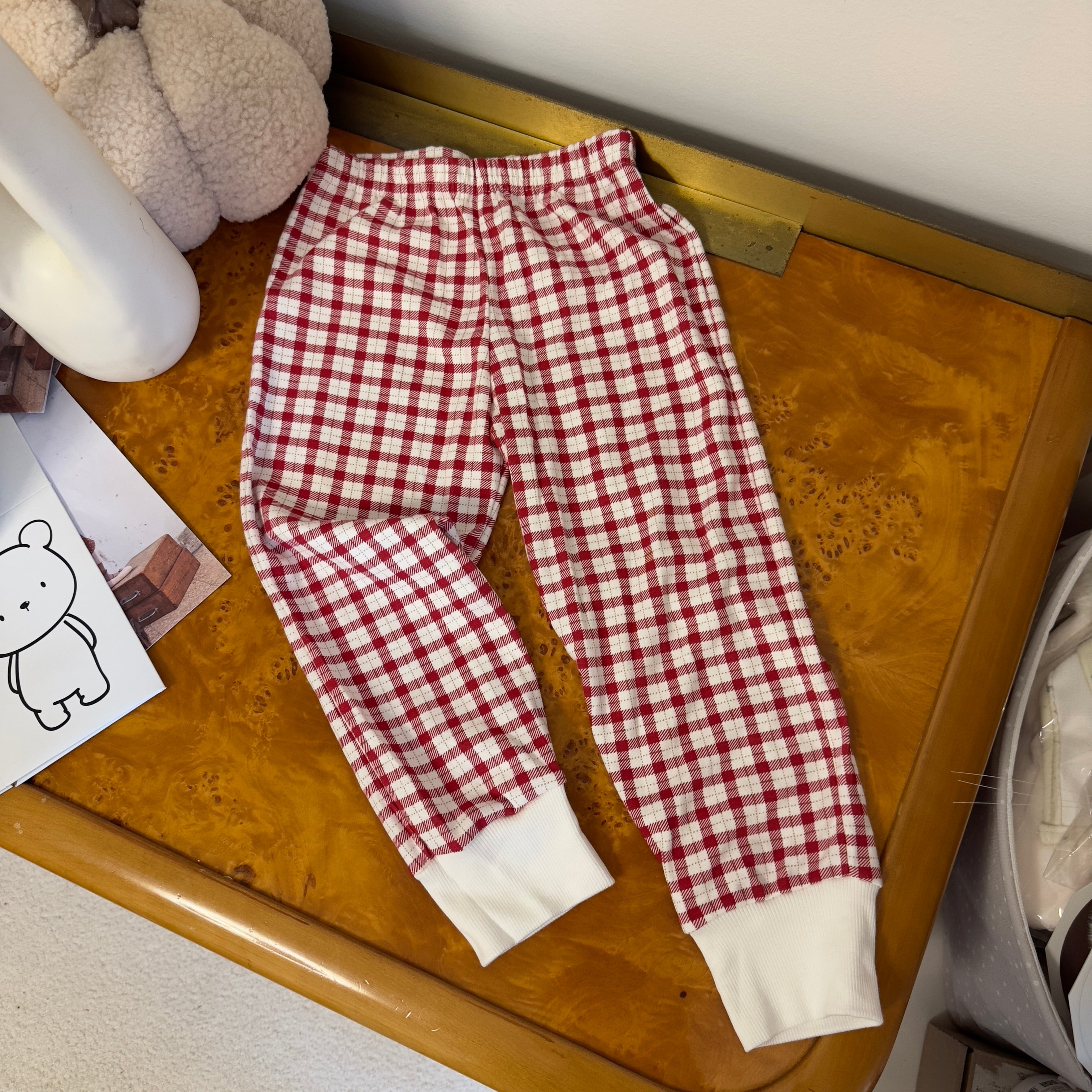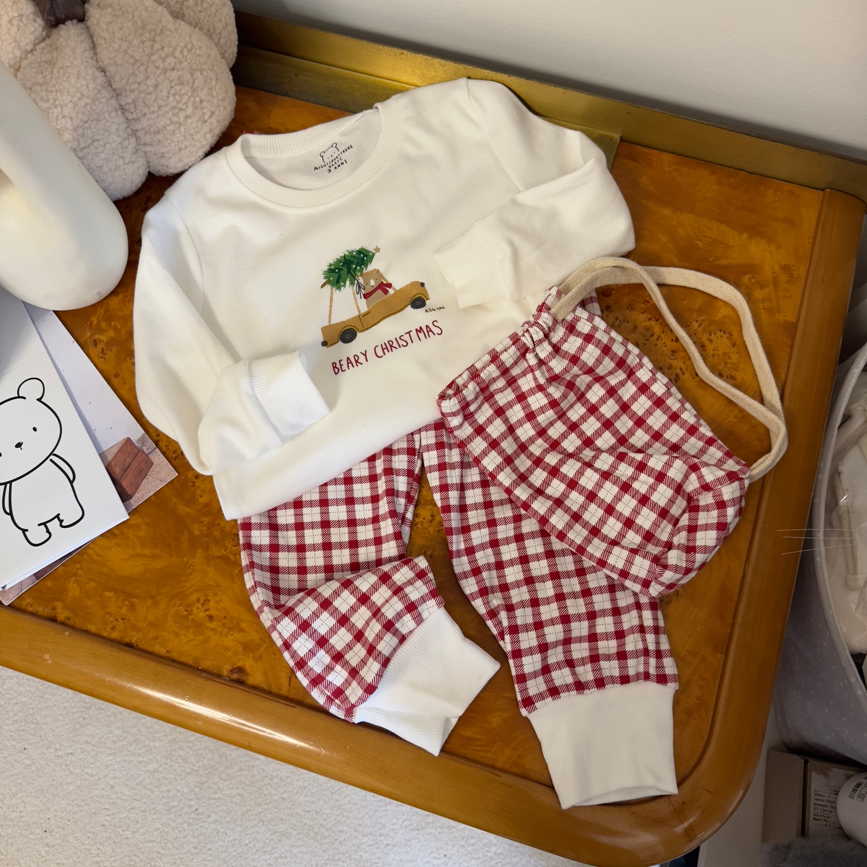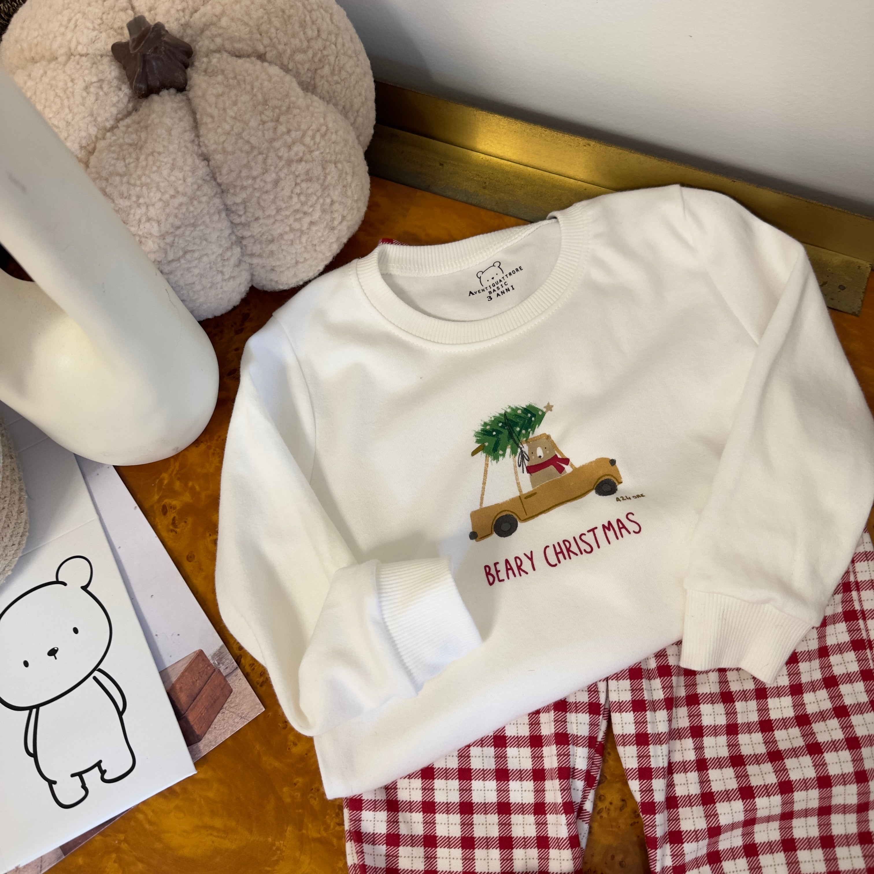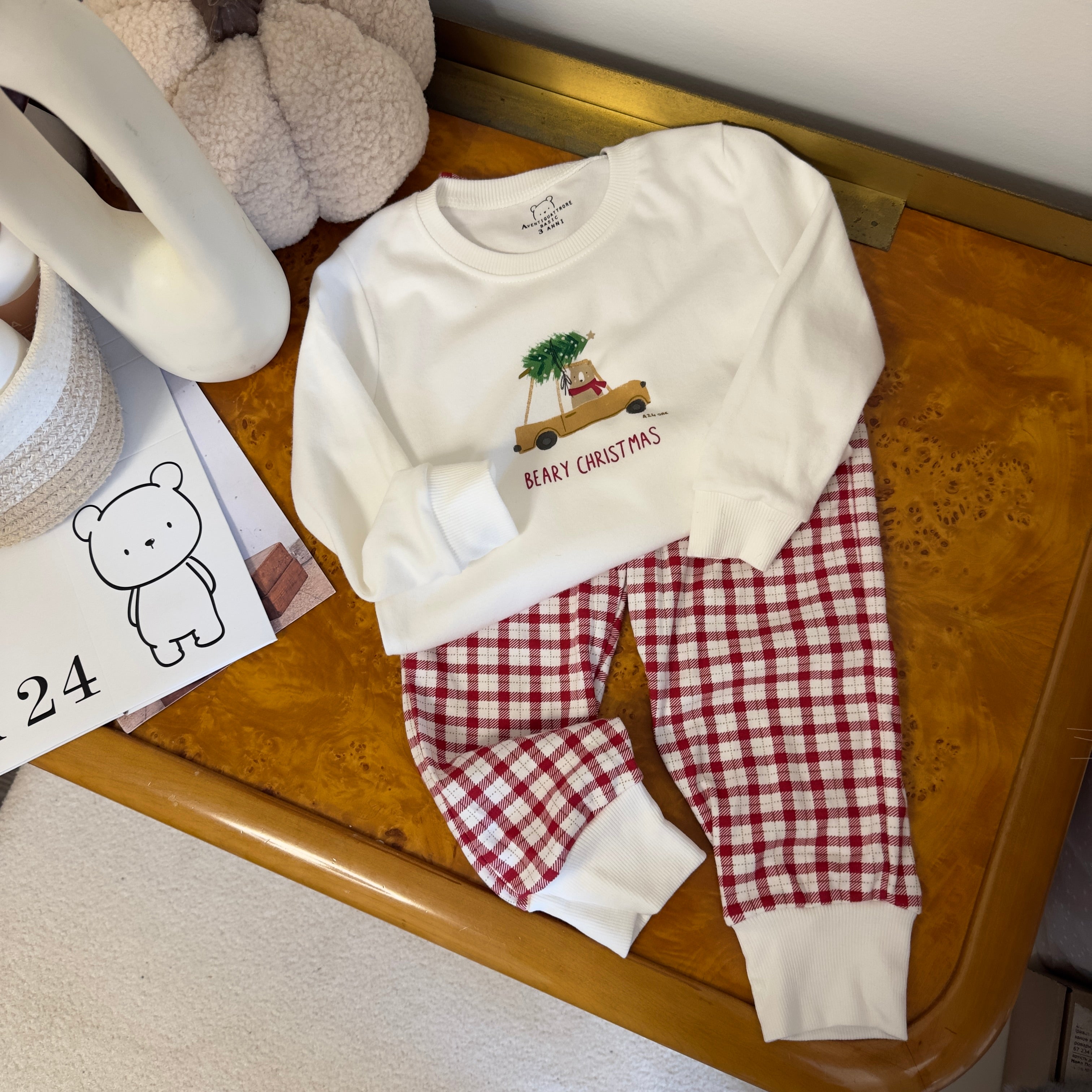 Composto da maglia con tenero orso che porta l’albero di Natale sulla macchina e da pantalone scozzese in coordinato, è ideale come abbigliamento da casa per bambini durante il periodo natalizio.