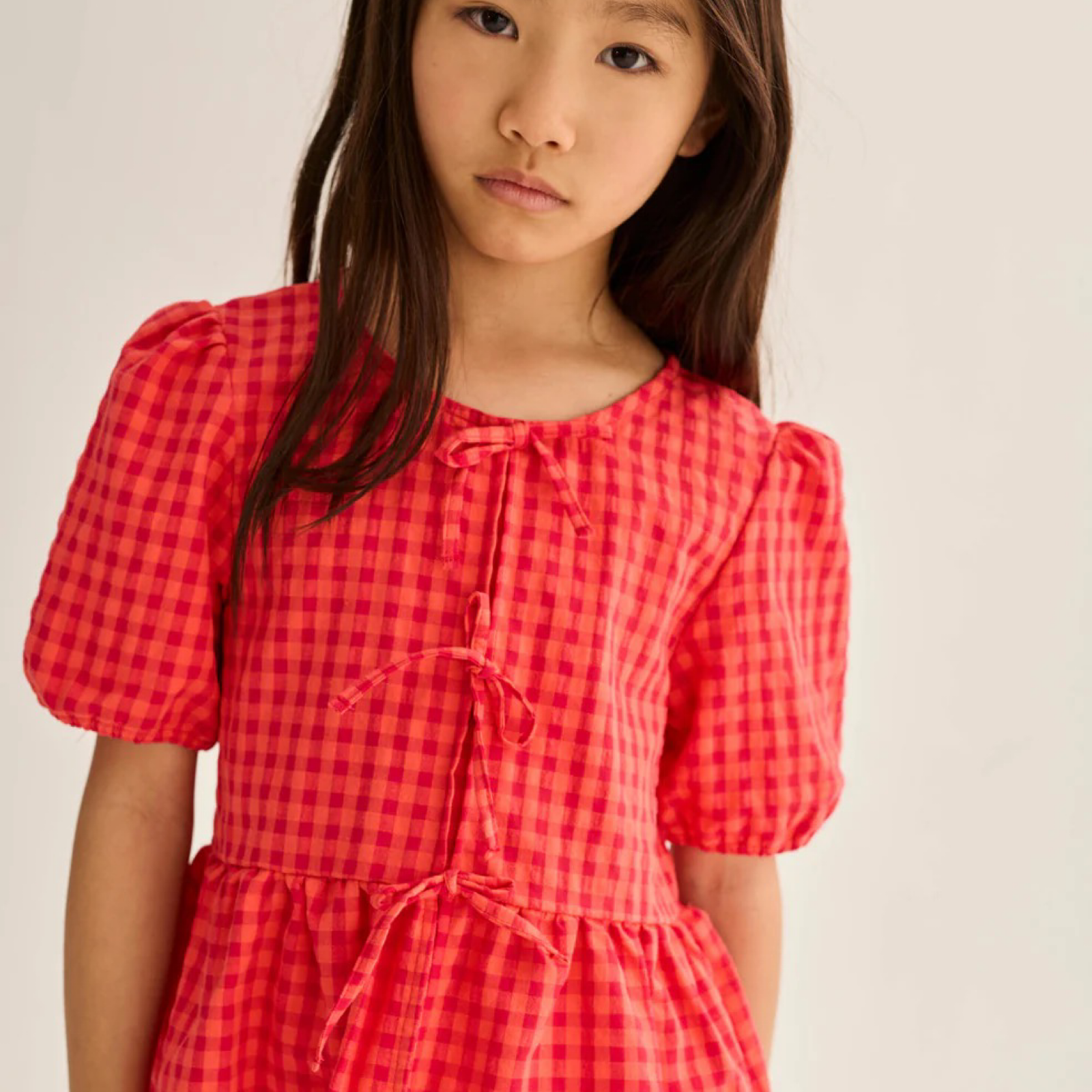 Questa blusa in cotone a quadretti Vichy con fiocchetti decorativi unisce stile e praticità in un capo facile da indossare e perfetto per ogni occasione. I fiocchetti sul davanti sono solo un dettaglio estetico, mentre la vera chiusura con bottoncino sul retro rende la blusa semplice e veloce da mettere.