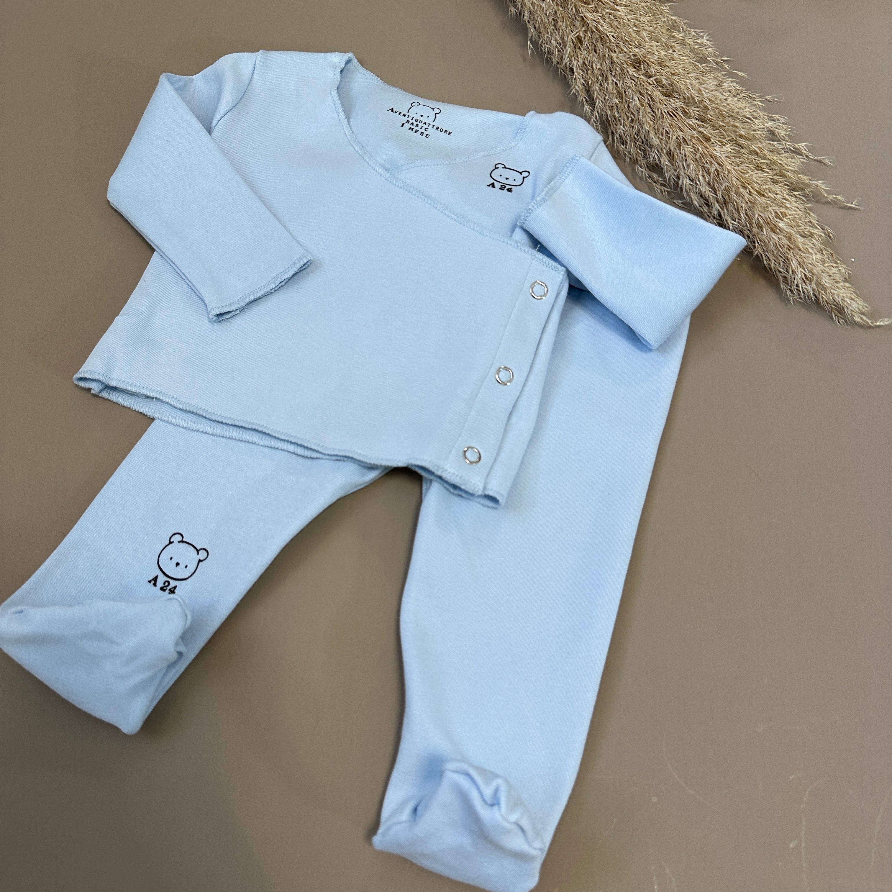 Completo neonato in morbido jersey di cotone color azzurro cielo, composto da maglia con pratica chiusura laterale antipanico e ghettina con piedini. Un set pensato per offrire massimo comfort e praticità fin dai primi giorni, avvolgendo il tuo piccolo con delicatezza. In omaggio una graziosa sacca in cotone abbinata, ideale per riporre piccoli accessori o ricordi preziosi.