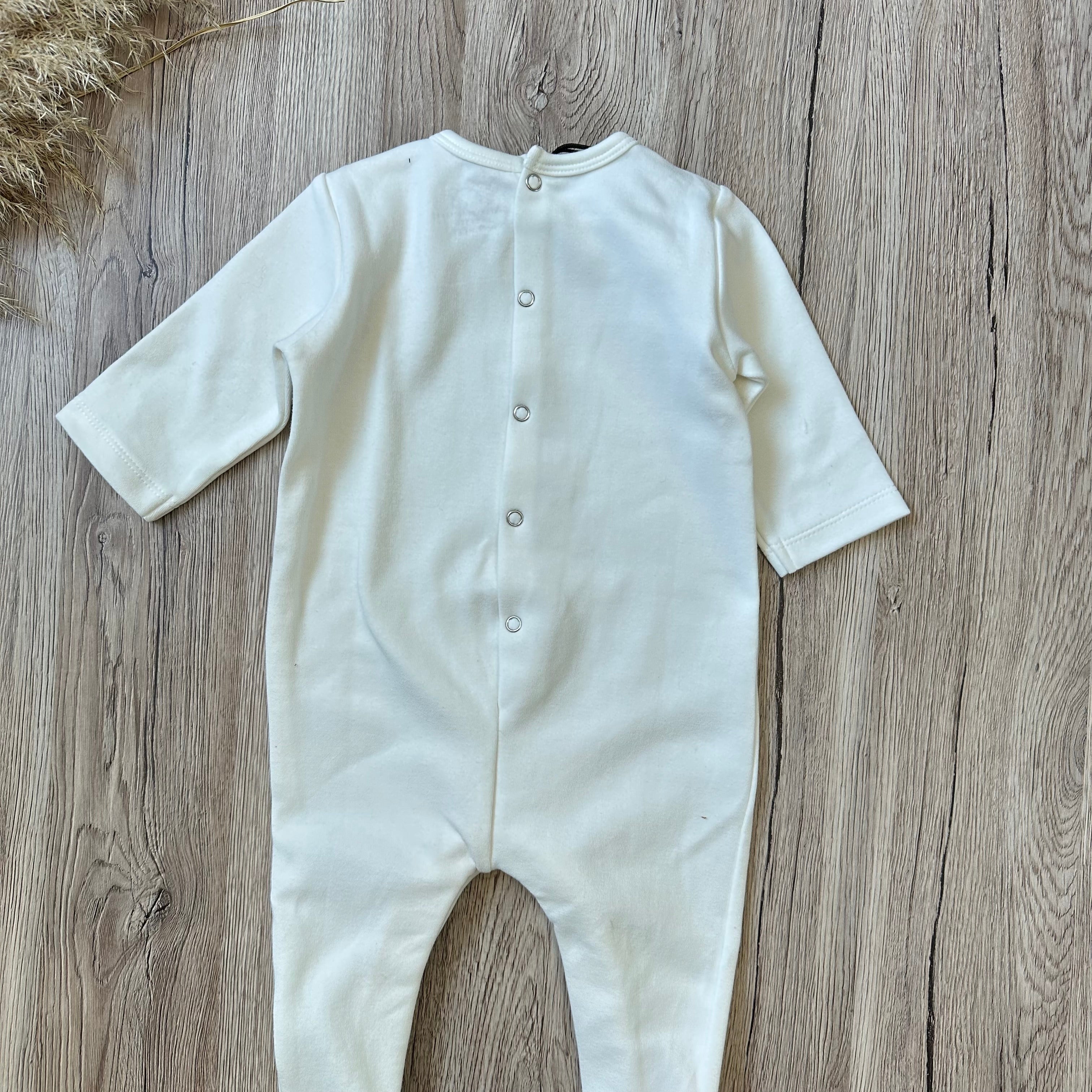 Una tutina pensata per avvolgere i primi mesi con comfort e tenerezza: realizzata in cotone morbidissimo, con piedini chiusi e pratica apertura sotto.