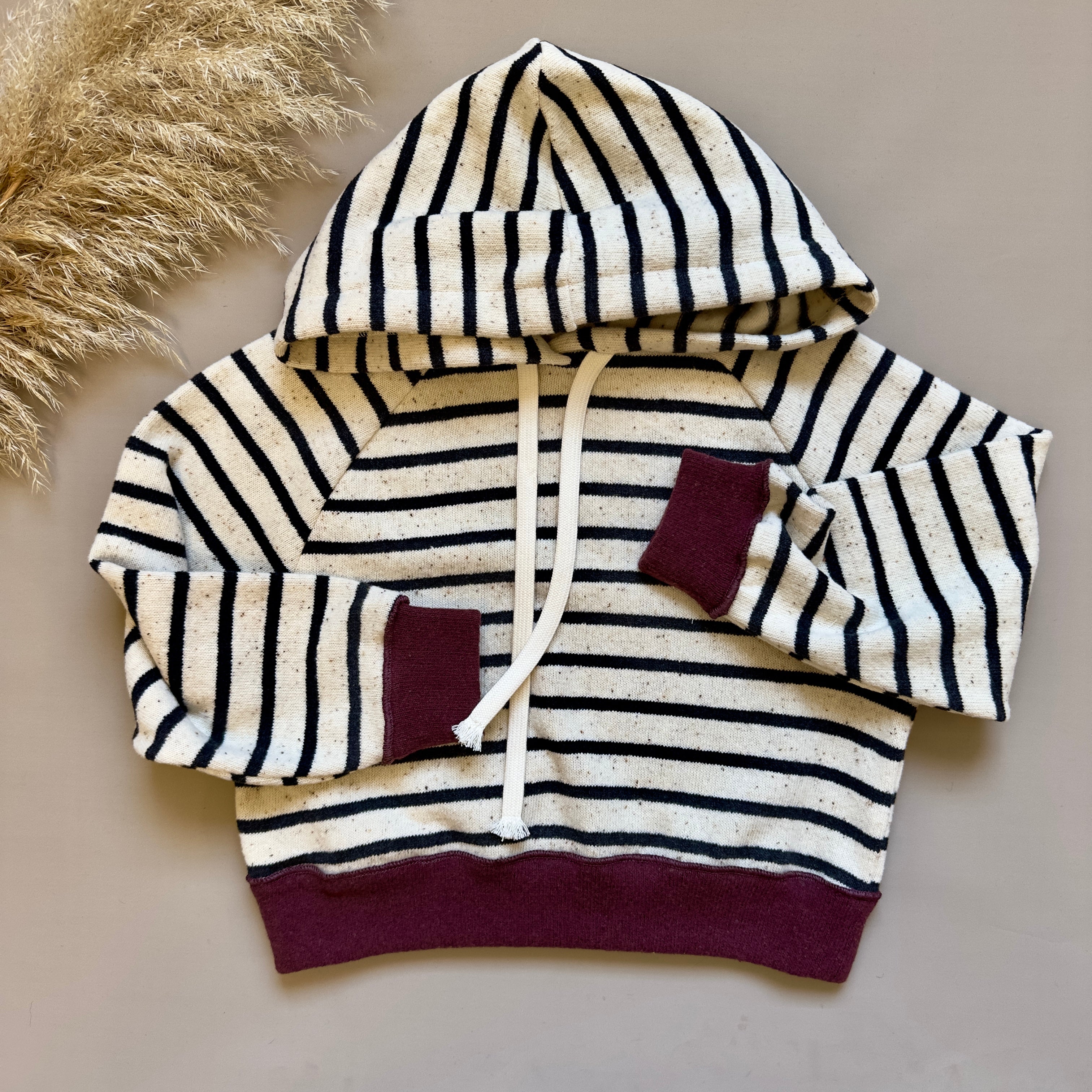 Felpa in caldo cotone qualità premium , morbidissima e confortevole. Il motivo a righe carbone e avorio con dettagli bordati burgundi conferisce un look elegante e raffinato. Un capo versatile, facile da abbinare e adatto a qualsiasi occasione, pratico da indossare e semplice da curare.