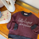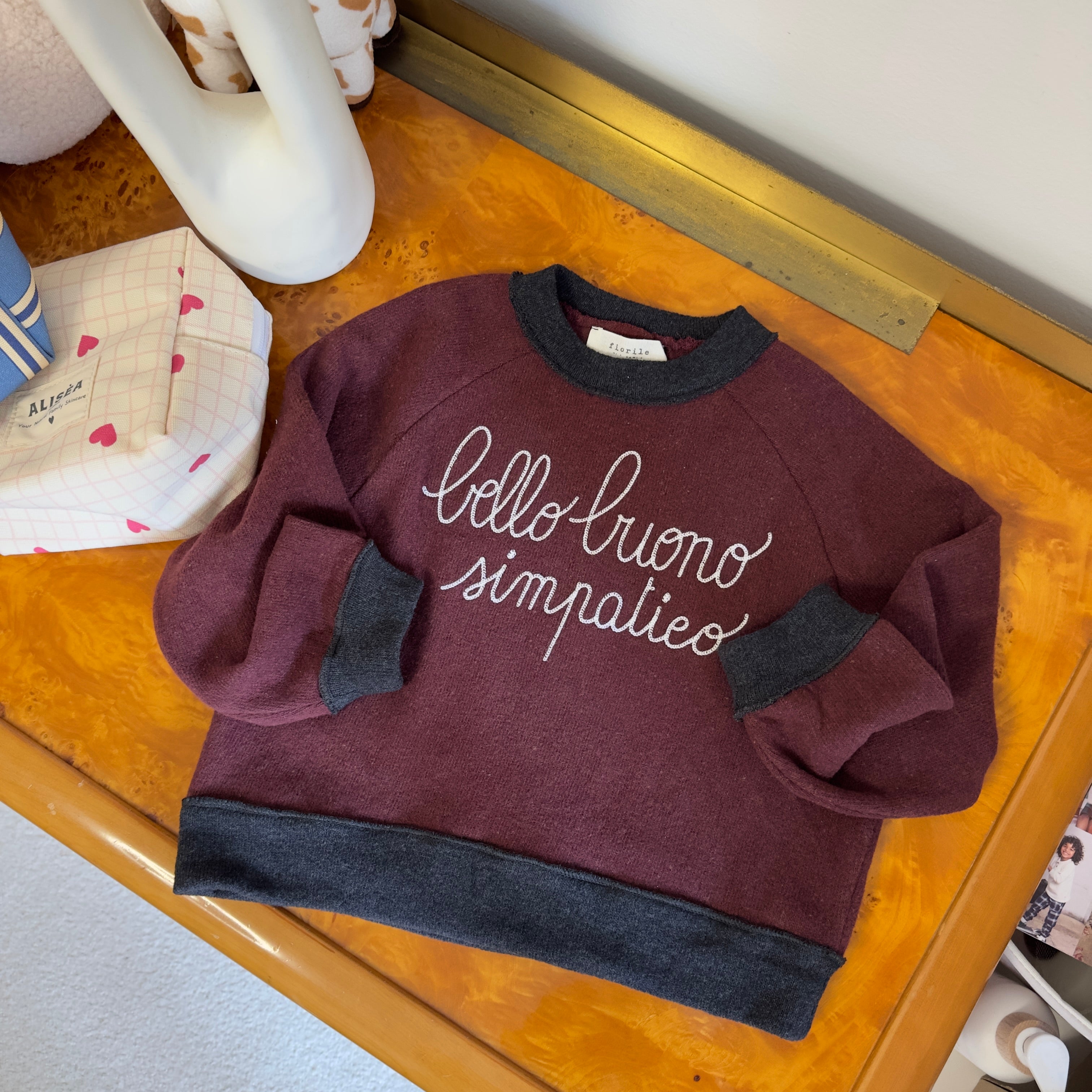 Maglione in caldo cotone morbidissimo, colore borgogna con dettagli antracite e la divertente scritta “Bello, buono e simpatico”. Un modello comodo e originale, perfetto per aggiungere un tocco di allegria e stile a qualsiasi occasione. Versatile, caldo e pensato per accompagnare ogni giornata con comfort e personalità.