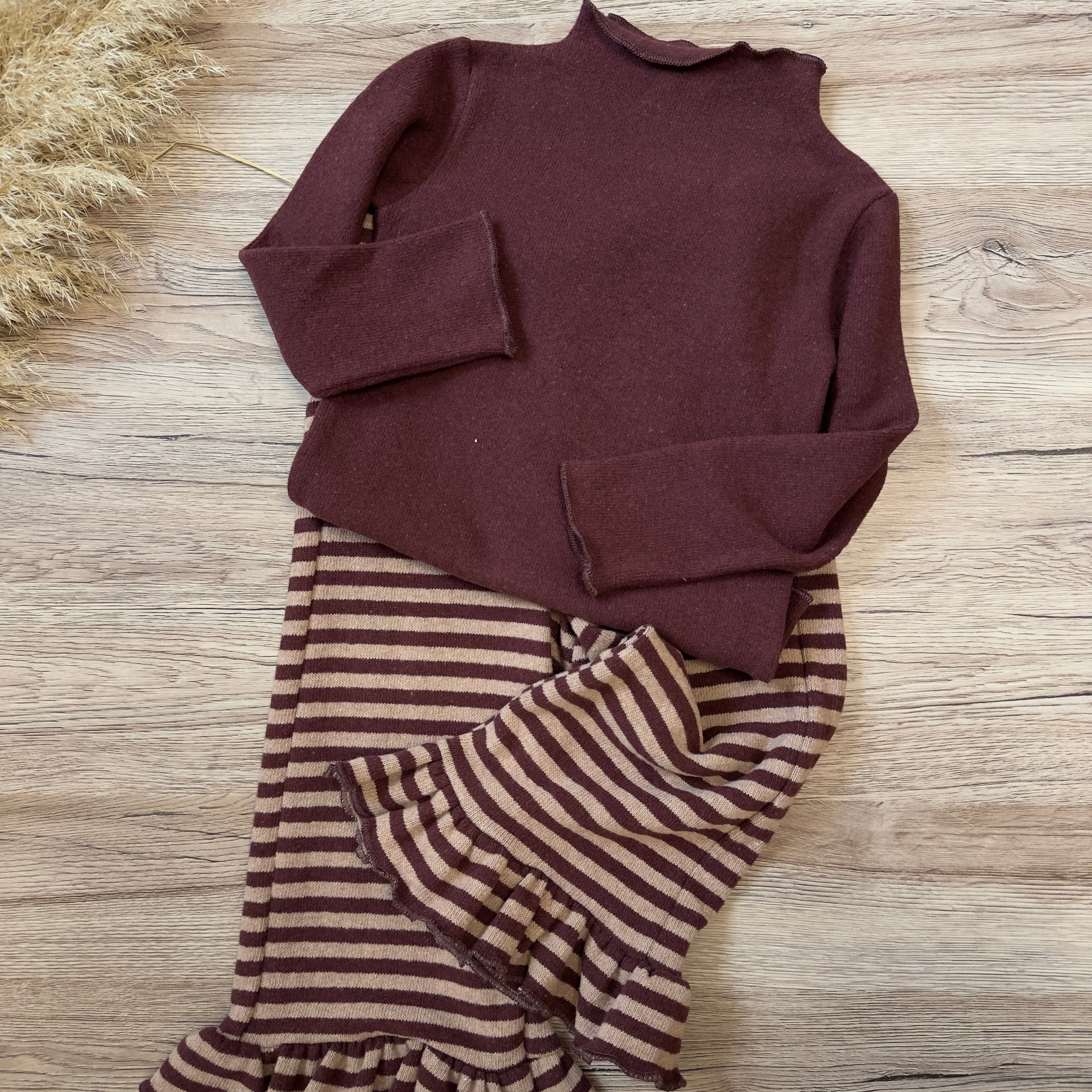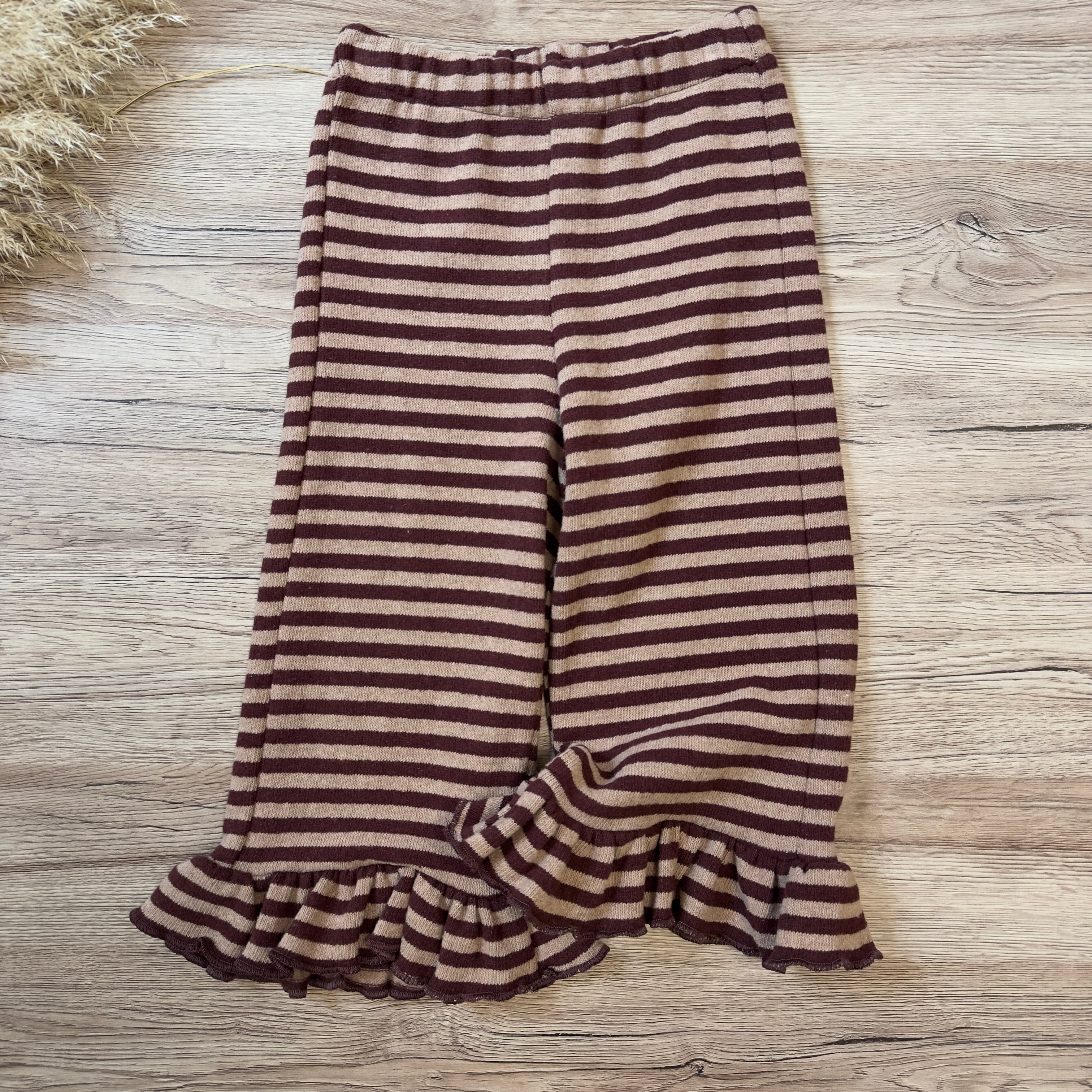 Pantaloni in caldo cotone a righe borgogna e pink blush- con ruches