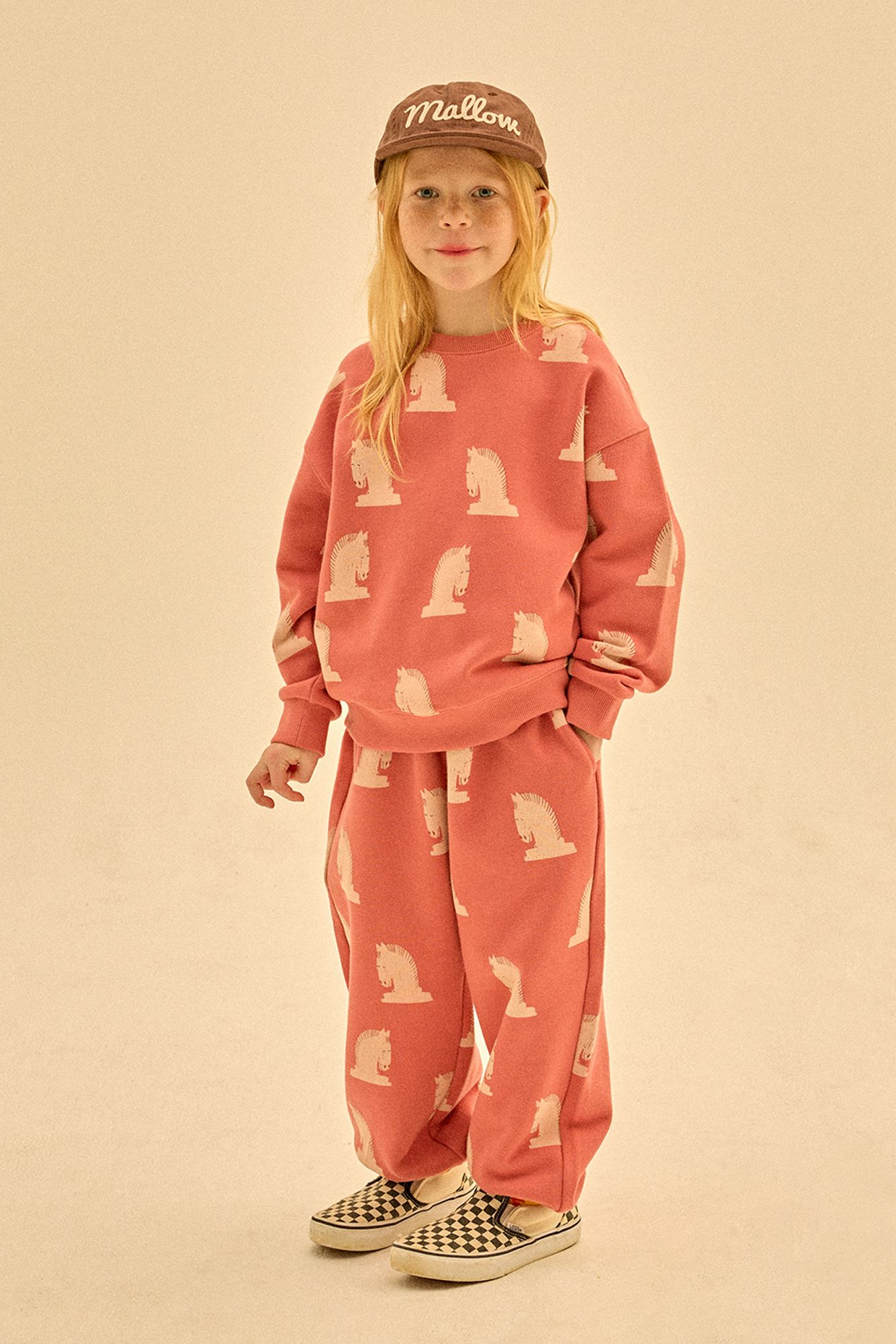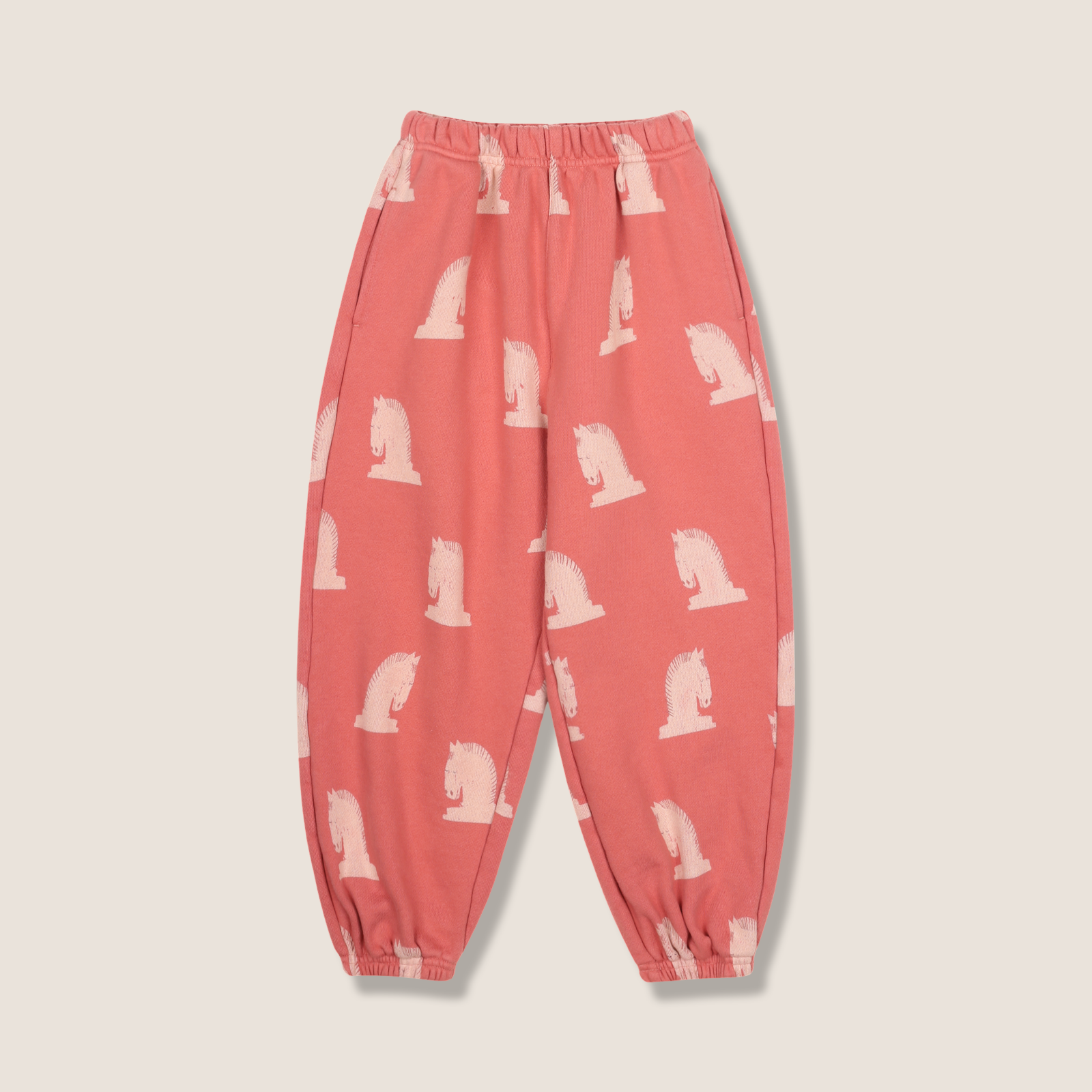 I pantaloni garzati Aladdin con cavalli degli scacchi si distinguono per il taglio ampio e fluido, che accompagna ogni passo con leggerezza. Il fondo corallo polveroso incontra la grafica dei cavalli, dando vita a un capo che mescola comfort e stile in modo spontaneo.