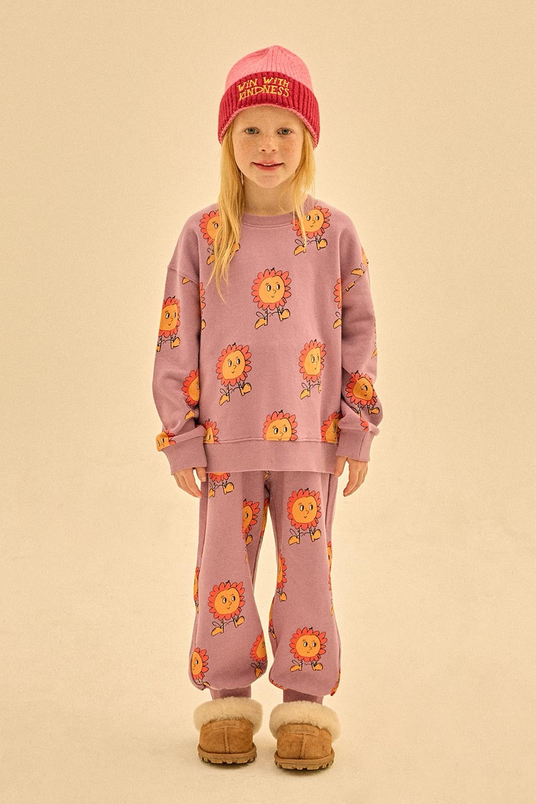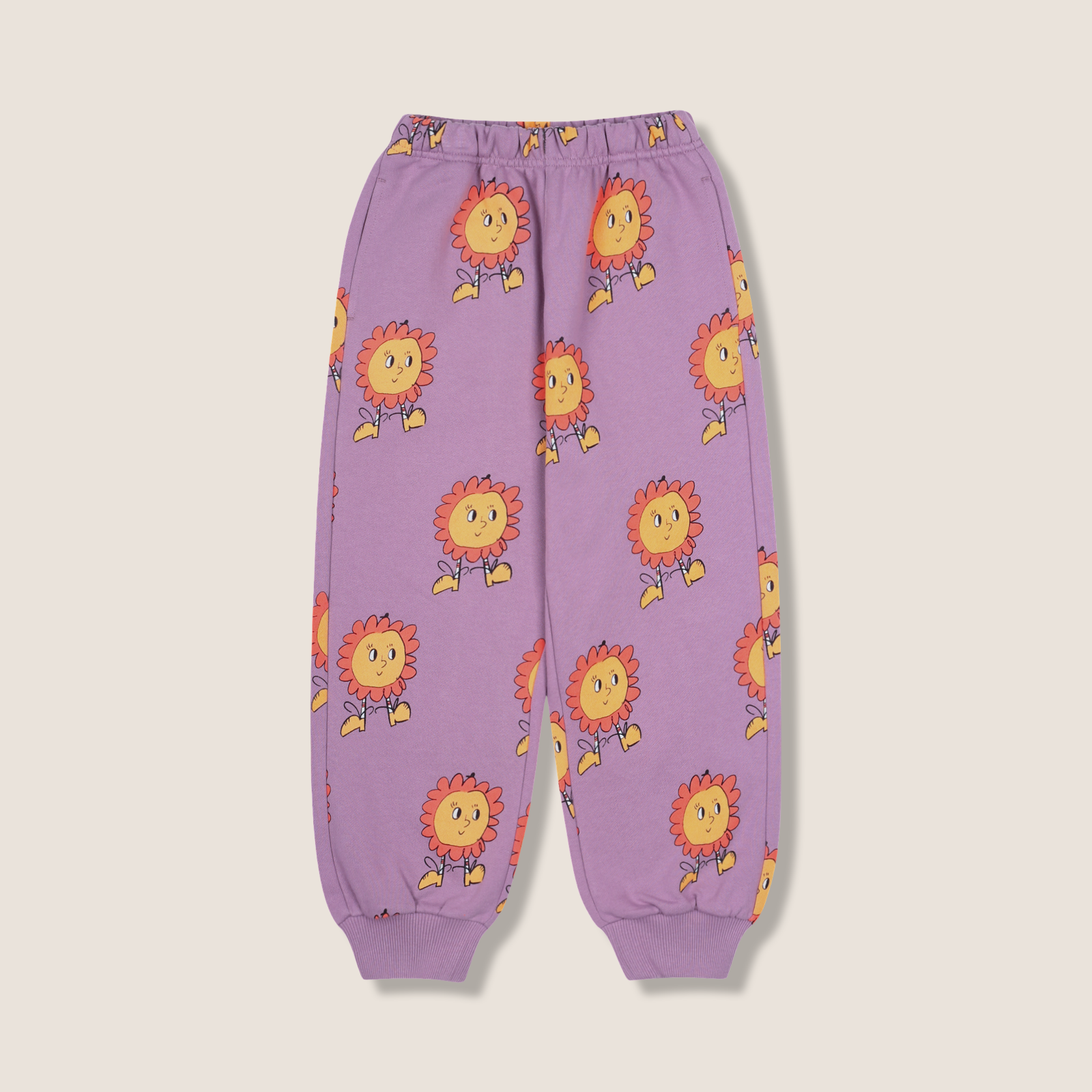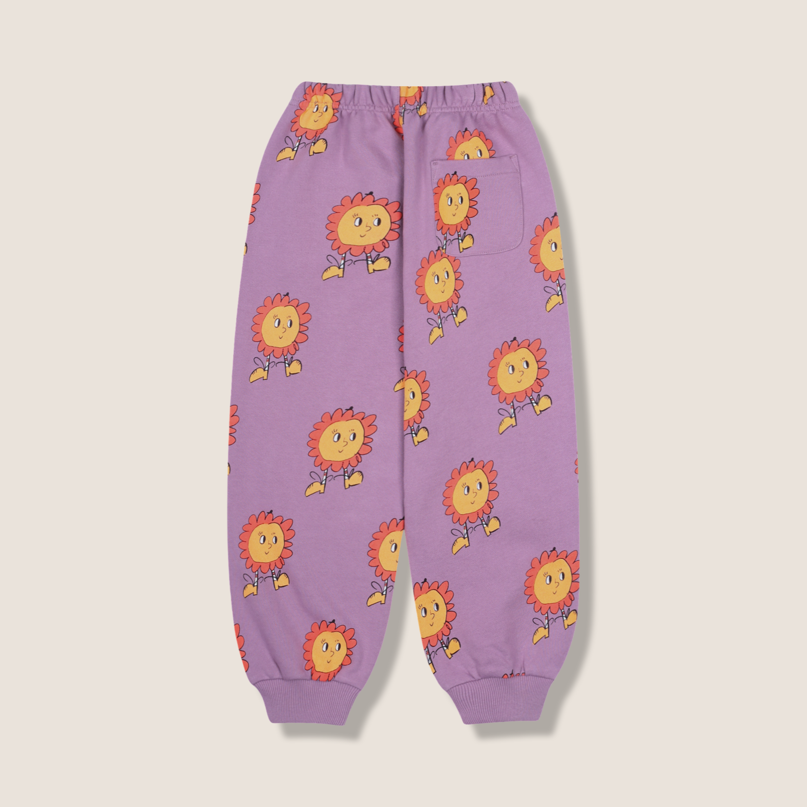 Pantalone garzato con fondo lilla e stampa a girasoli stilizzati nei toni del giallo e dell’arancio. Un’esplosione di colore delicata ma decisa, perfetta per aggiungere un tocco di allegria a ogni look.