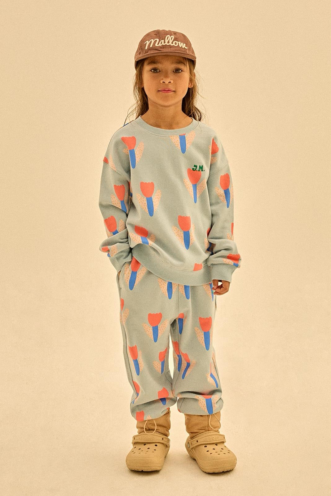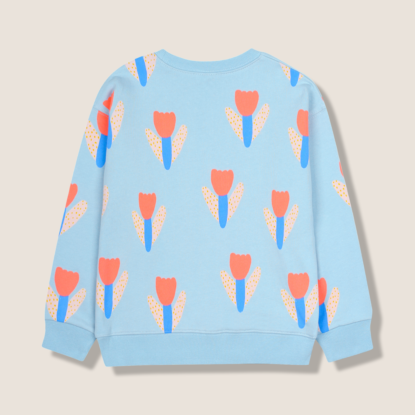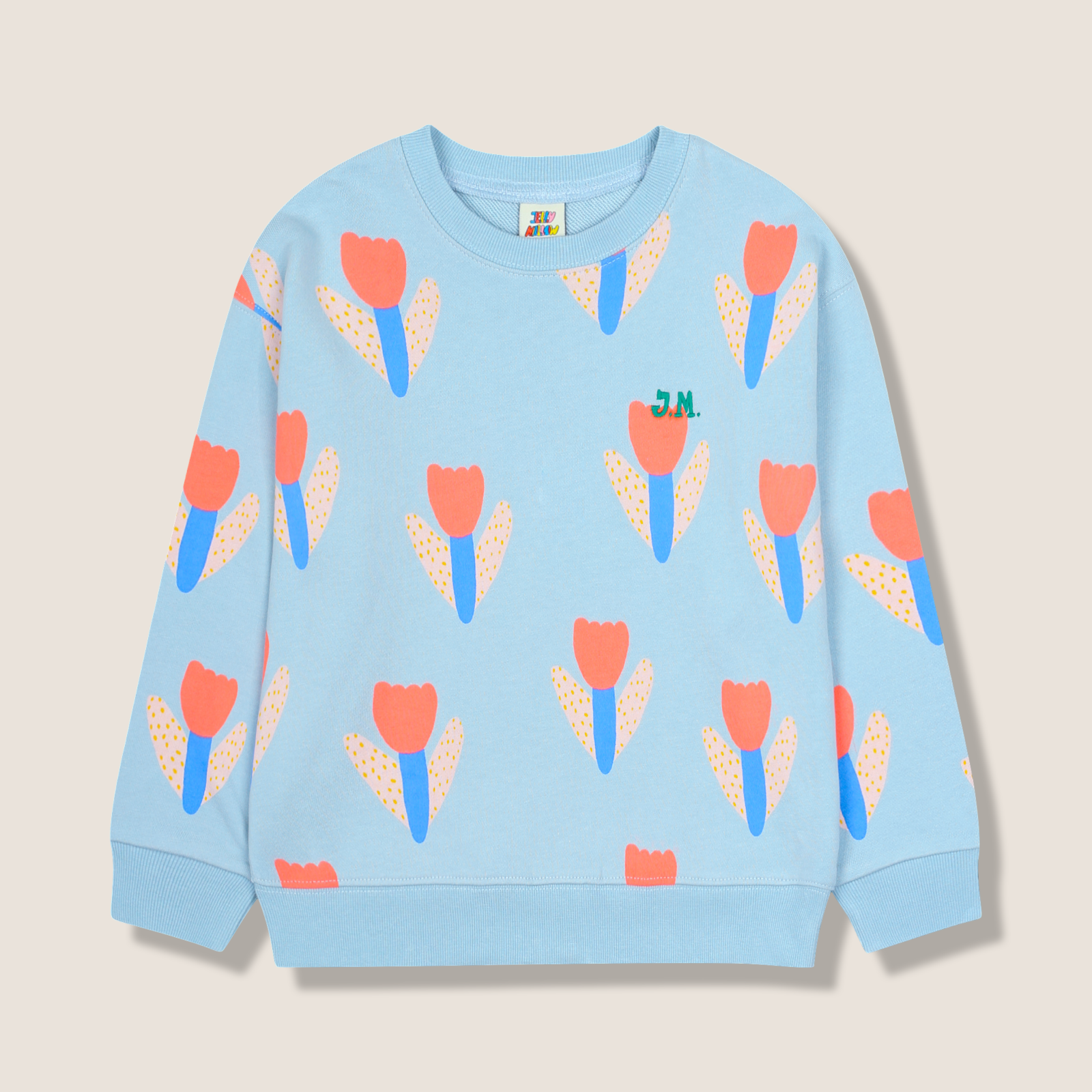 Un azzurro polvere che sa di cielo quieto, e un pattern di tulipani stilizzati che sbocciano con leggerezza: questa felpa unisce linee pulite e dettagli poetici. Il design floreale dona un tocco grafico, mai eccessivo, che accompagna il capo con equilibrio e originalità.