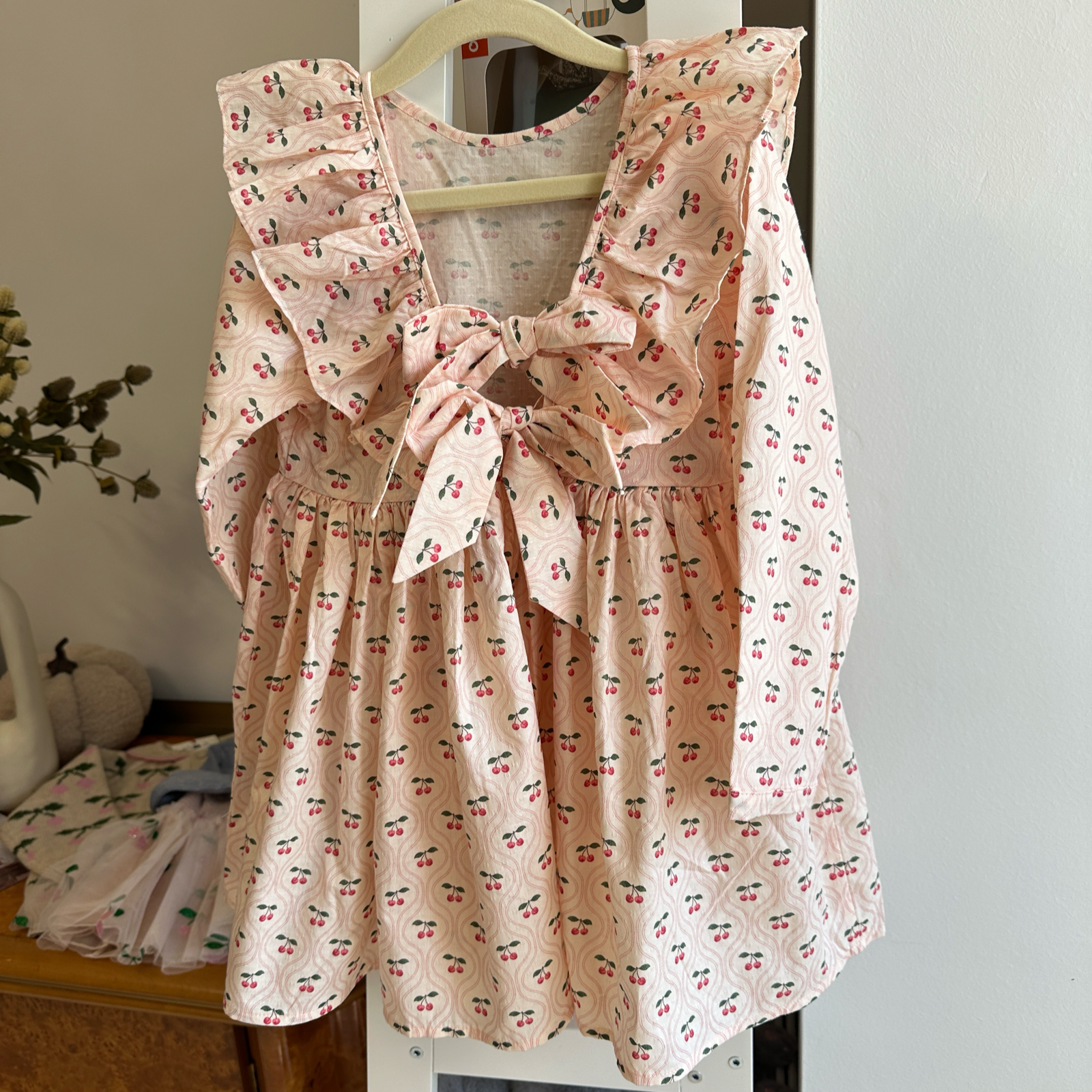 Abito in cotone organico con fiocchi e ruches – Stampa esclusiva ciliegie