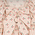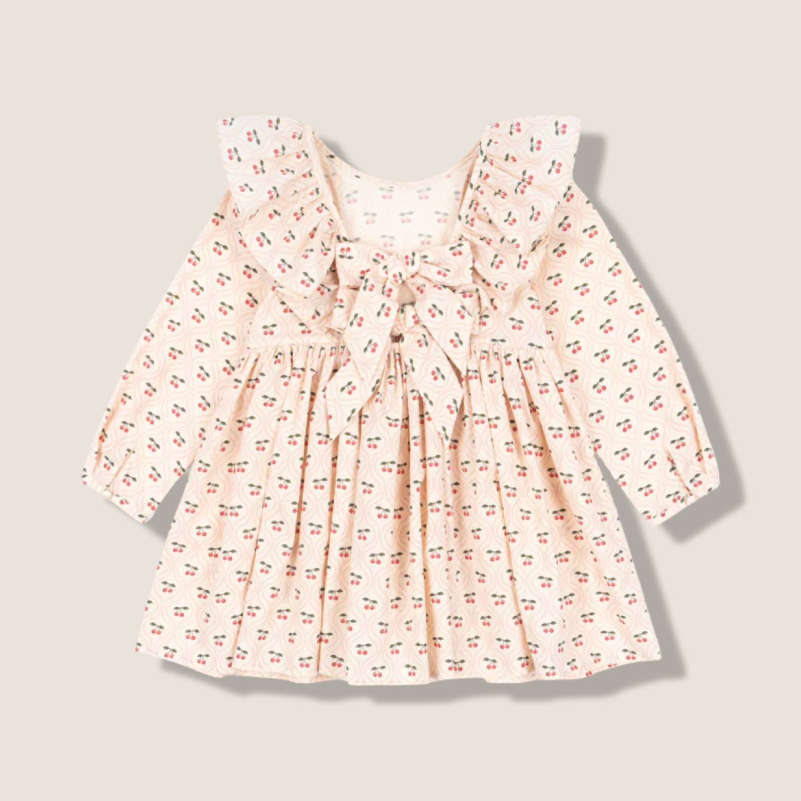 Un abito in 100% cotone organico con una raffinata stampa esclusiva ciliegie. Le ruches sulle spalle e i fiocchi sul retro aggiungono dettagli ricercati che lo rendono unico. Elegante, comodo e versatile, accompagna la tua