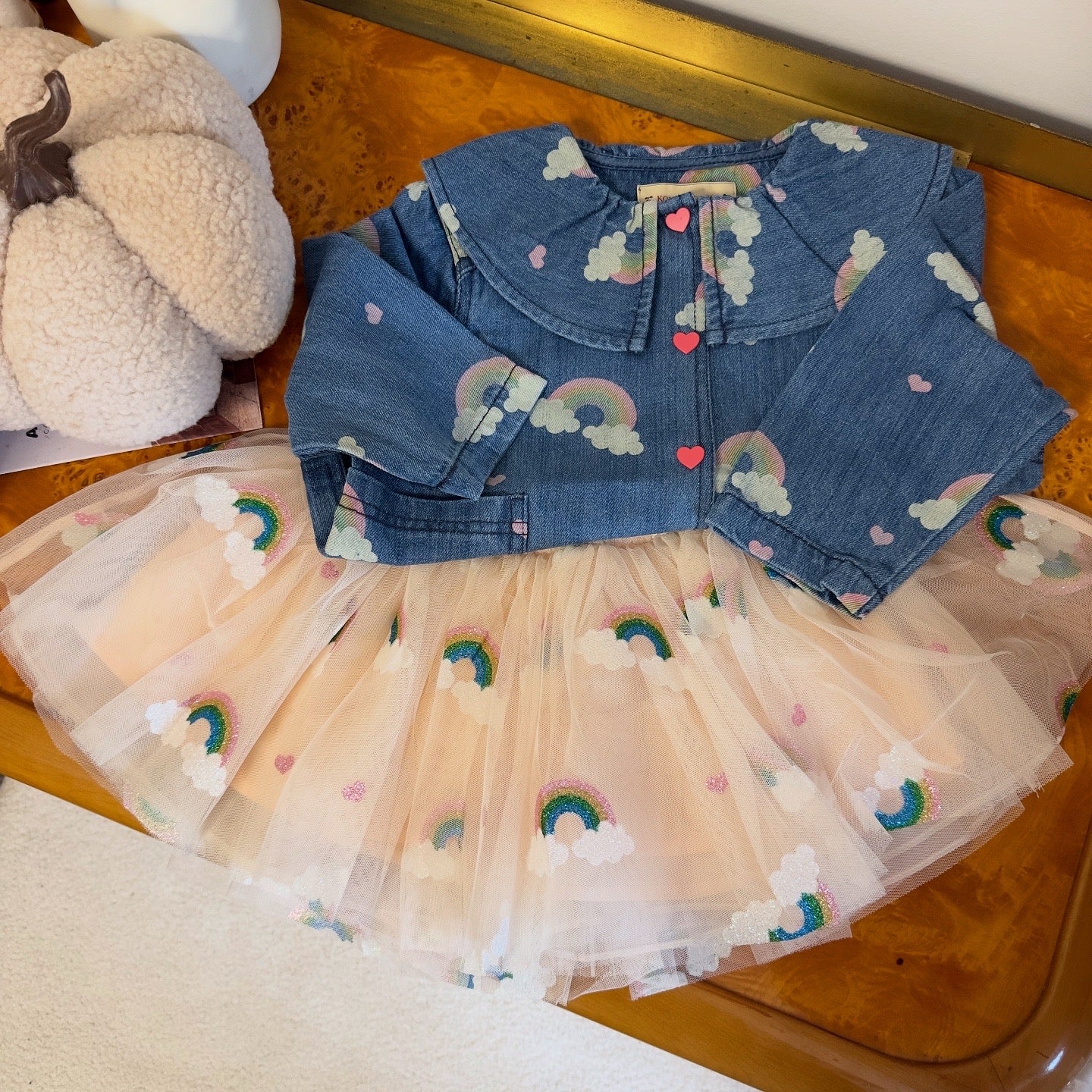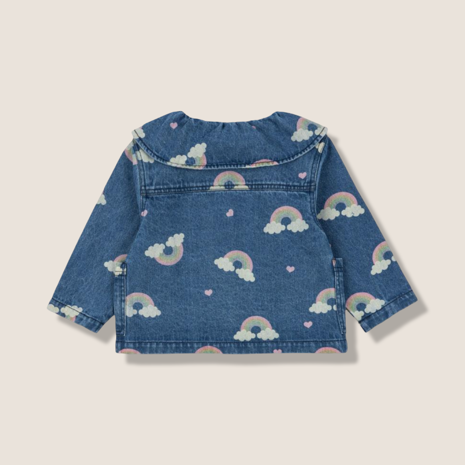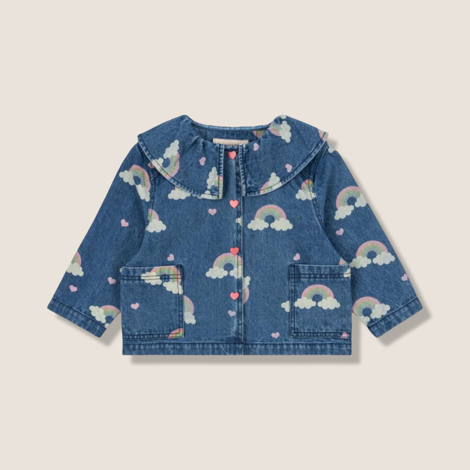 Giacca in denim morbidissimo, realizzata in cotone certificato GOTS, pensata per tutte le stagioni. Versatile e leggera, può essere indossata come giacca o come camicia, rendendo ogni outfit semplice e veloce da creare. La stampa esclusiva con gli arcobaleni aggiunge un tocco giocoso e colorato, perfetta per accompagnare i bambini in ogni momento della giornata.