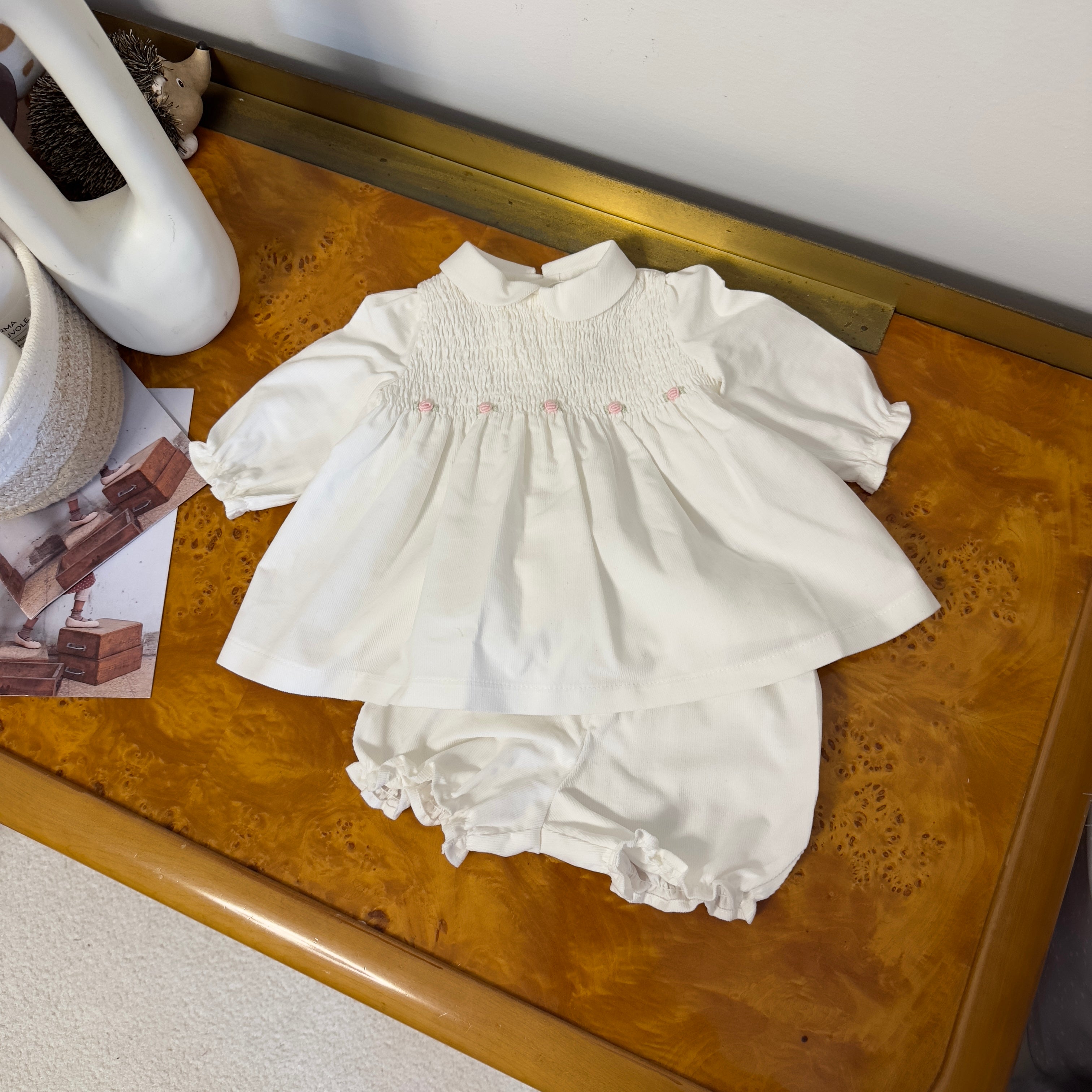 Set bloomer e abitino in micro velluto con punto smock e roseline – latte