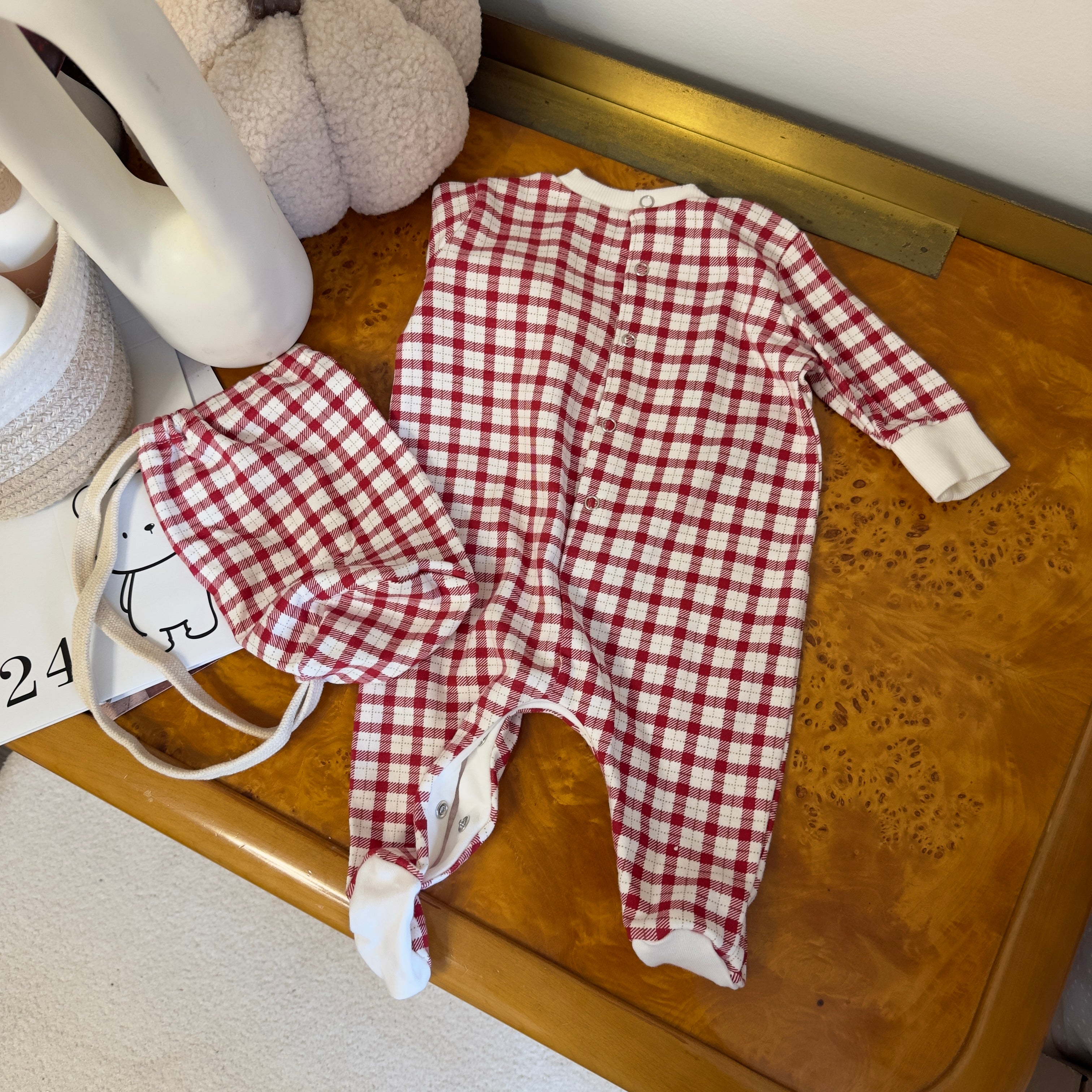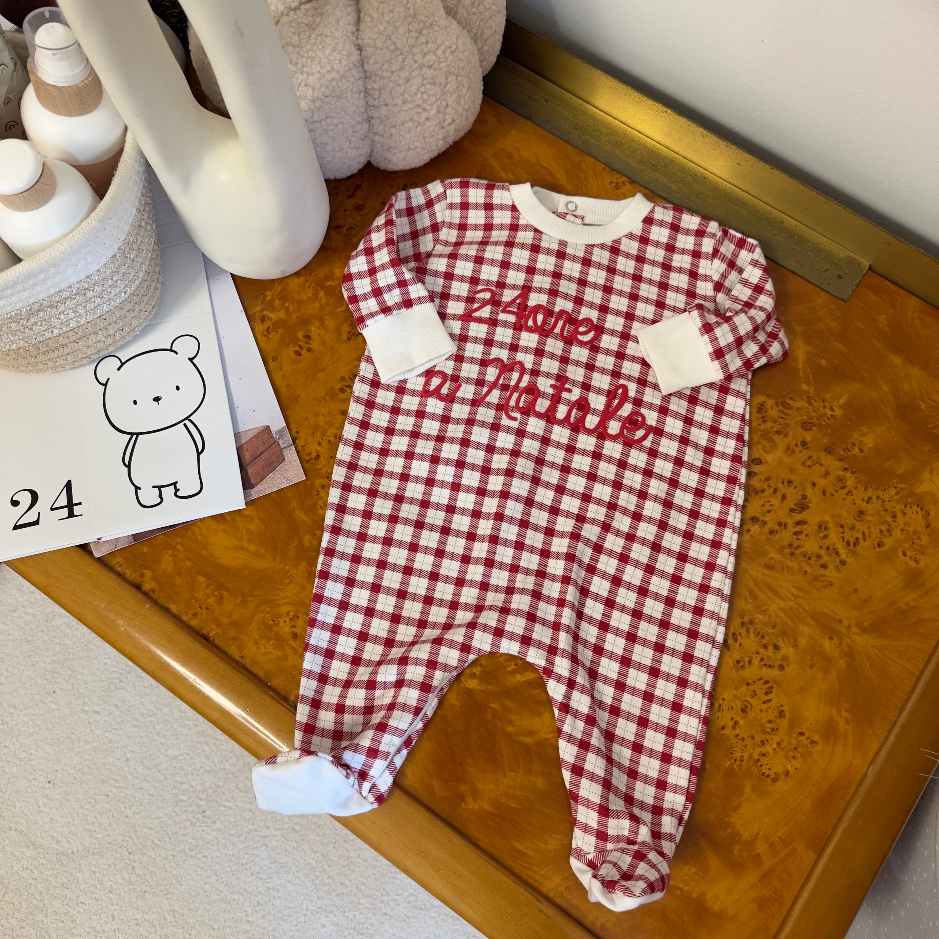 Il dolce ricamo “24 ore a Natale” si unisce alla fantasia a quadrettini scozzese, per un look che unisce comfort e stile in piena atmosfera natalizia.
