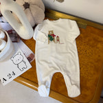 Questa tutina con piedini è decorata con i due dolci orsetti di Natale ed è comodissima grazie all’apertura sia sotto che sul retro.