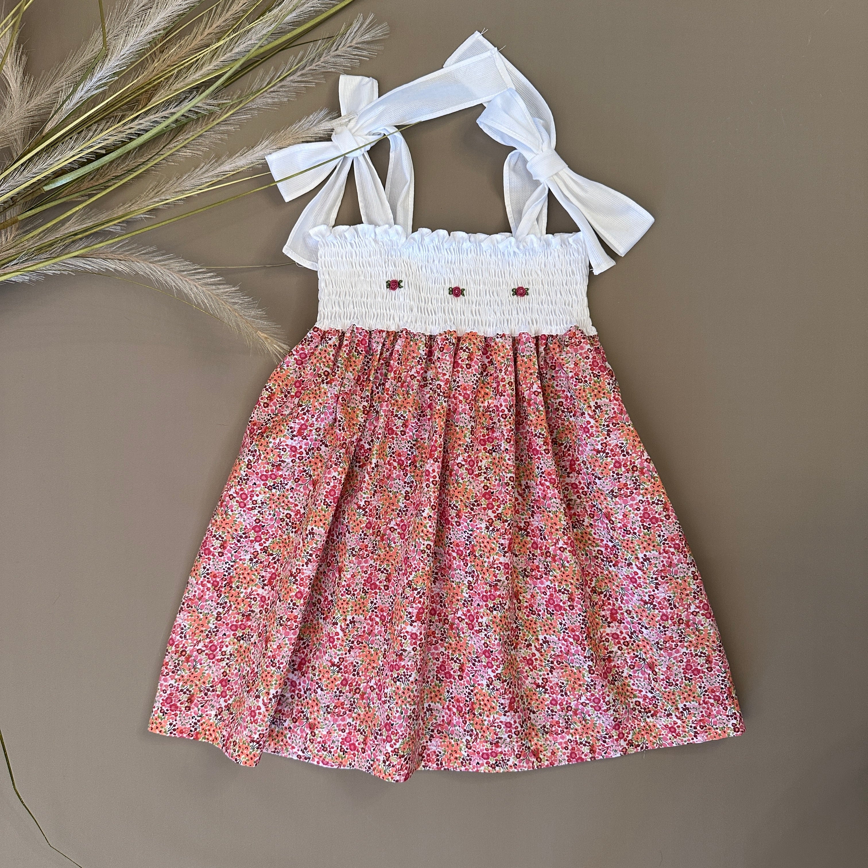 Un abito romantico e curato nei minimi dettagli: il top in punto smock è arricchito da delicate roseline ricamate, che aggiungono un tocco di eleganza. Le bretelle regolabili, da annodare con un fiocco, garantiscono una vestibilità perfetta e un comfort assoluto. Un capo raffinato e versatile, perfetto per le giornate speciali e per chi ama i dettagli preziosi.