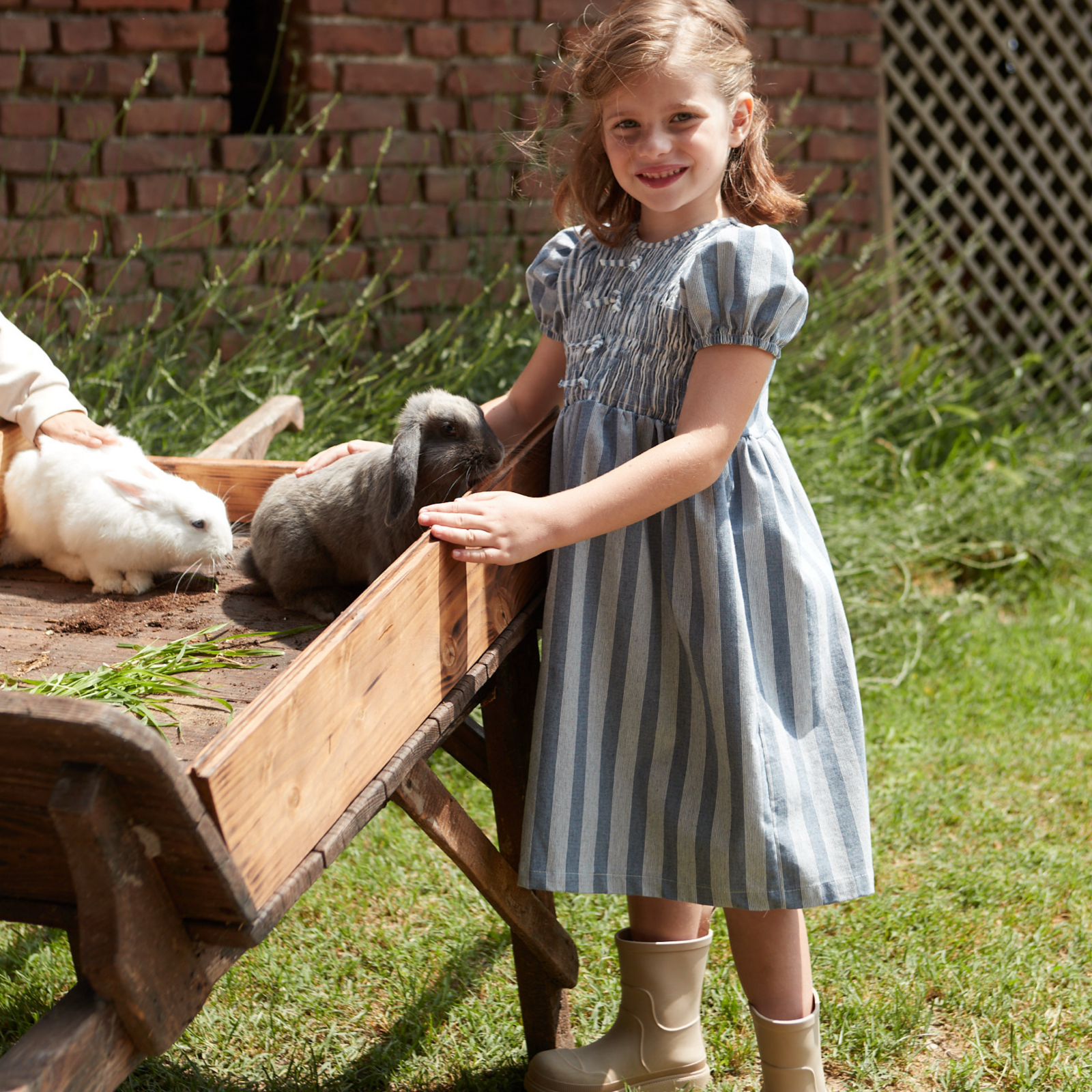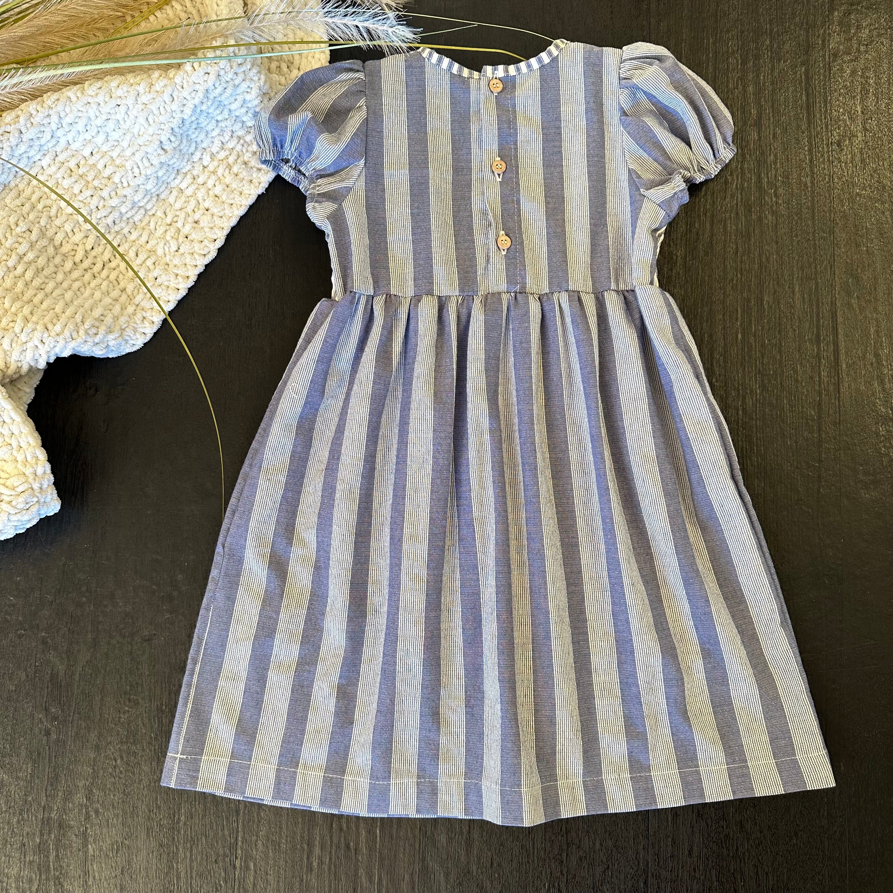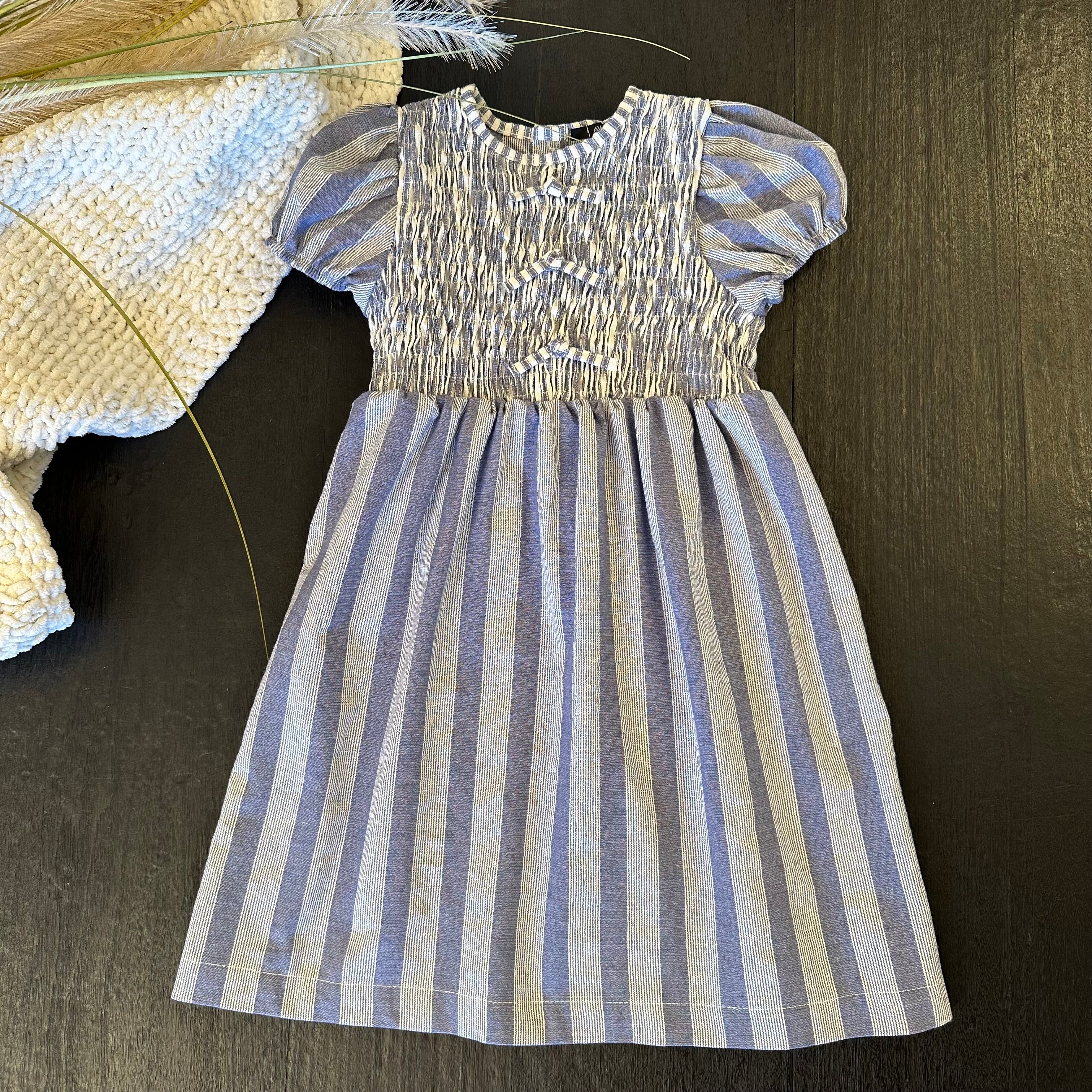 Un abito dal fascino senza tempo, con delicato punto smock che esalta la silhouette e dona un tocco raffinato. Il tessuto rigato nei toni del blu jeans lo rende perfetto per look freschi e sofisticati, da indossare in ogni occasione.