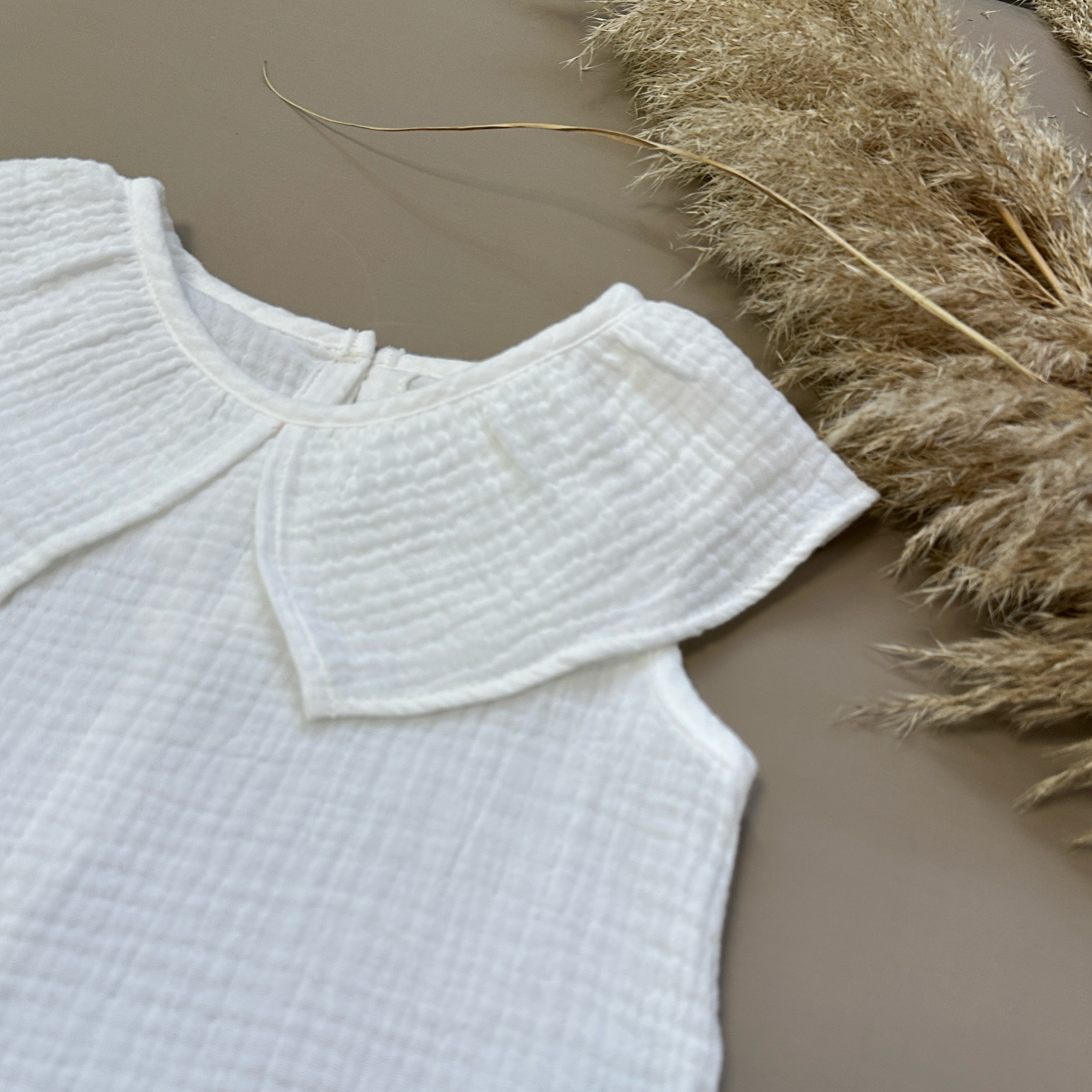 Un capo delicato e sofisticato. La blusa in mussola di cotone color latte si distingue per il suo colletto elegante, che aggiunge un tocco di classe senza tempo. Il tessuto leggero e traspirante la rende perfetta per ogni stagione, garantendo comfort e stile in ogni occasione. Facile da abbinare, è l’essenza della raffinatezza naturale.