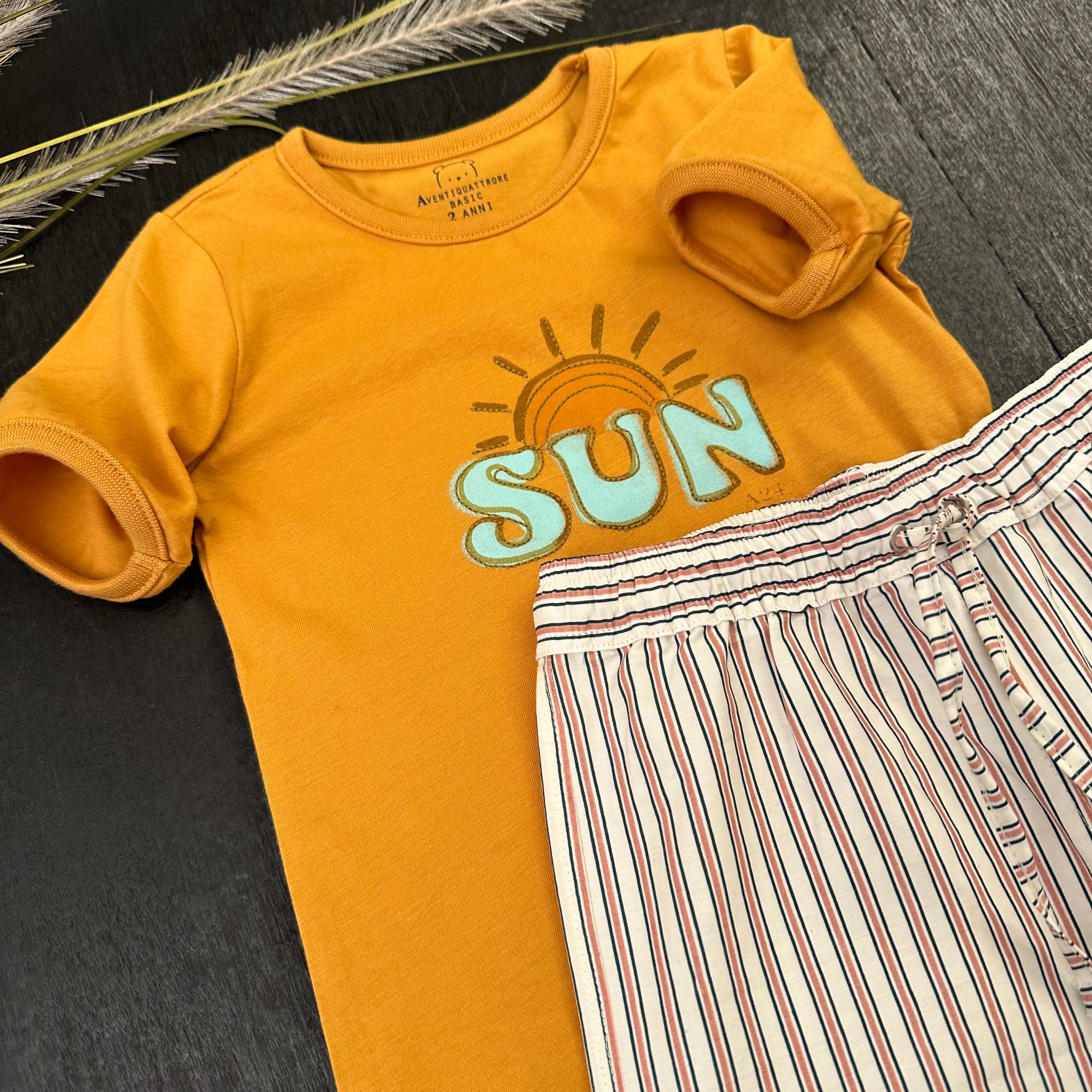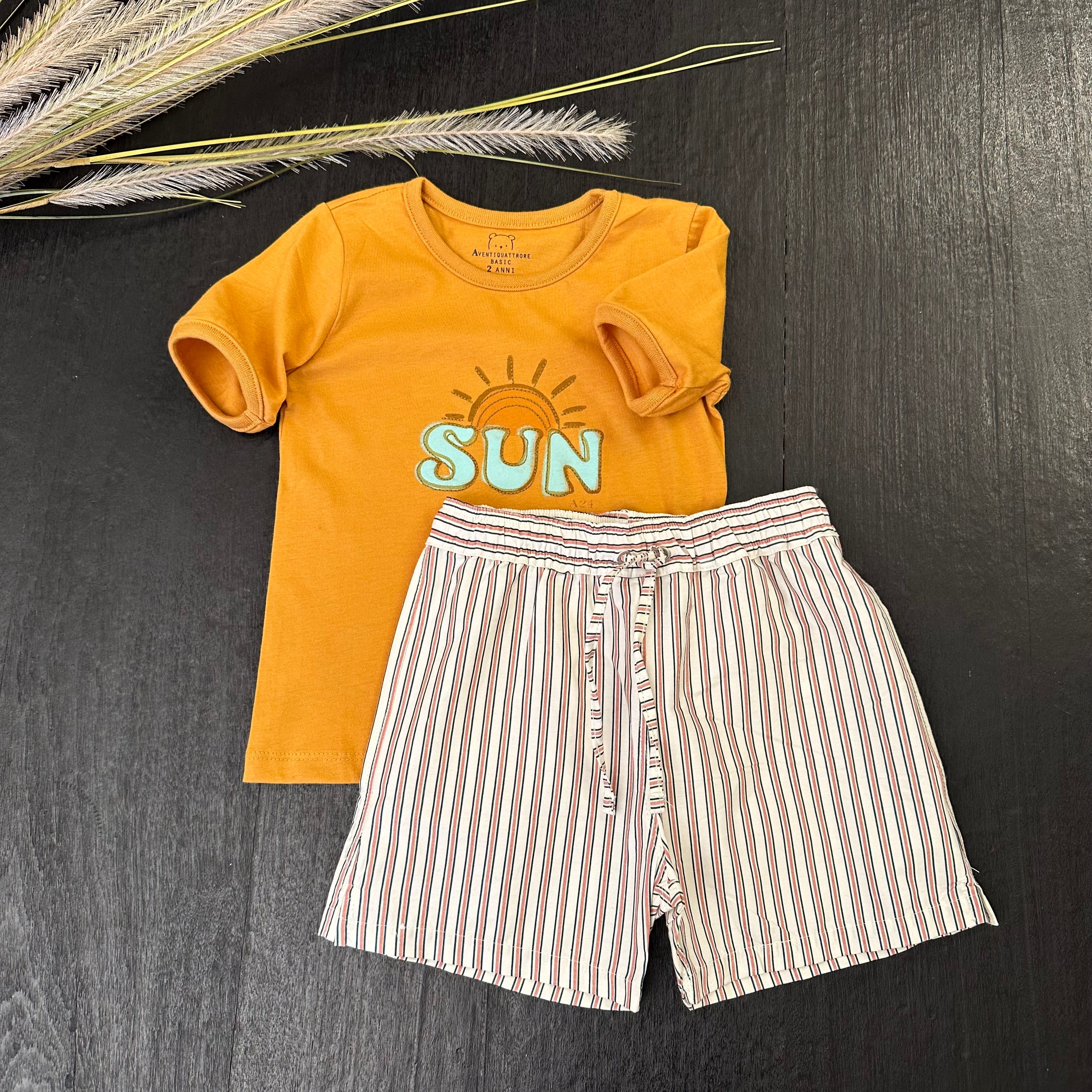 Perfetto per il mare e non solo, questo completo è composto da una t-shirt in cotone e un bermuda dal design comodo e versatile. Ideale per nuotare, giocare e passeggiare, assicura freschezza e libertà di movimento con un look sempre curato. Un must-have per l’estate!