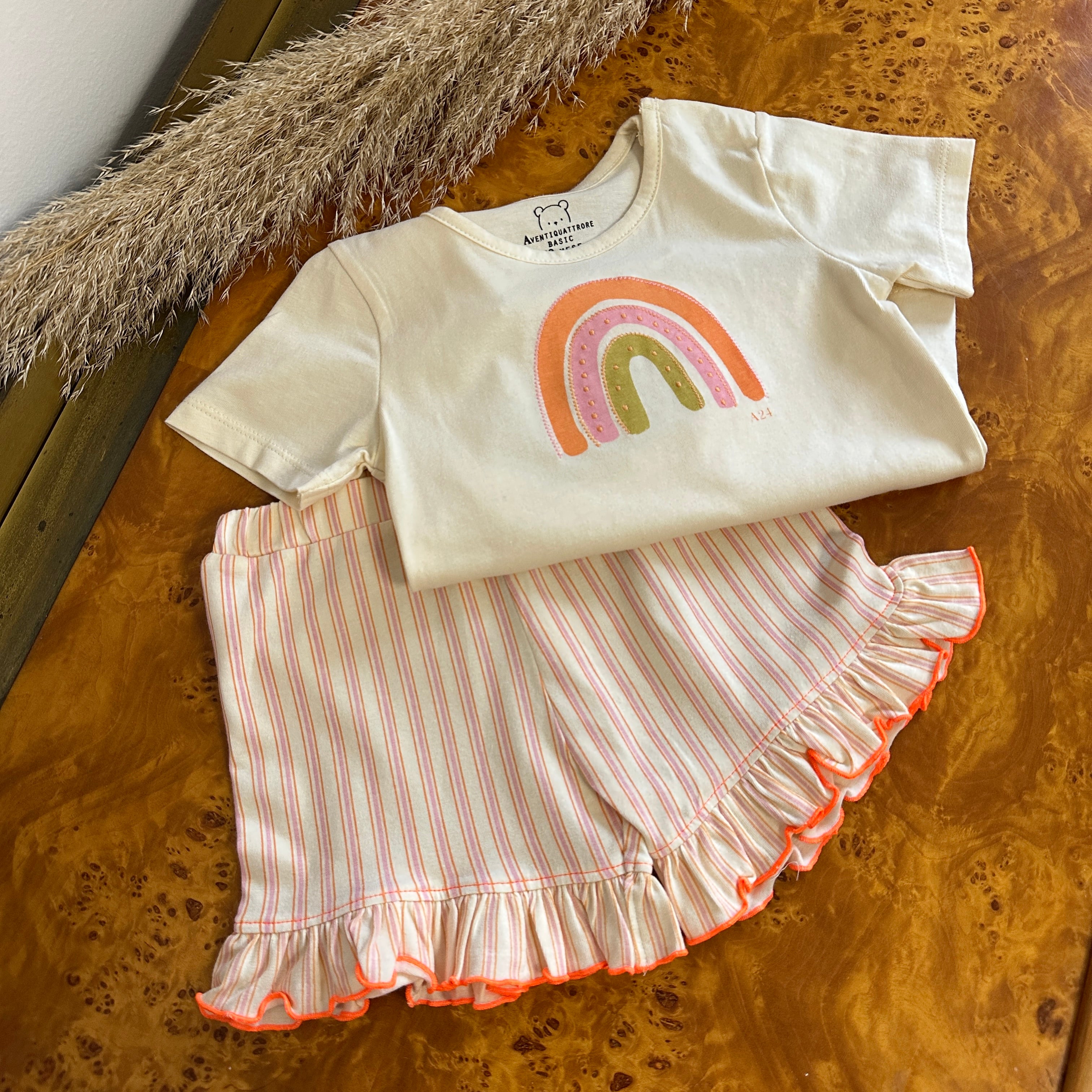 Un mix perfetto tra comfort e stile: questo pantaloncino in jersey di cotone rigato è pensato per accompagnare con leggerezza ogni avventura estiva. Il taglio morbido è impreziosito da una ruches sul fondo, rifinita con una righina fluo che illumina il look con un tocco di colore vivace e moderno. Fresco, leggero e facile da abbinare, è ideale da indossare con t-shirt o top nei mesi più caldi.