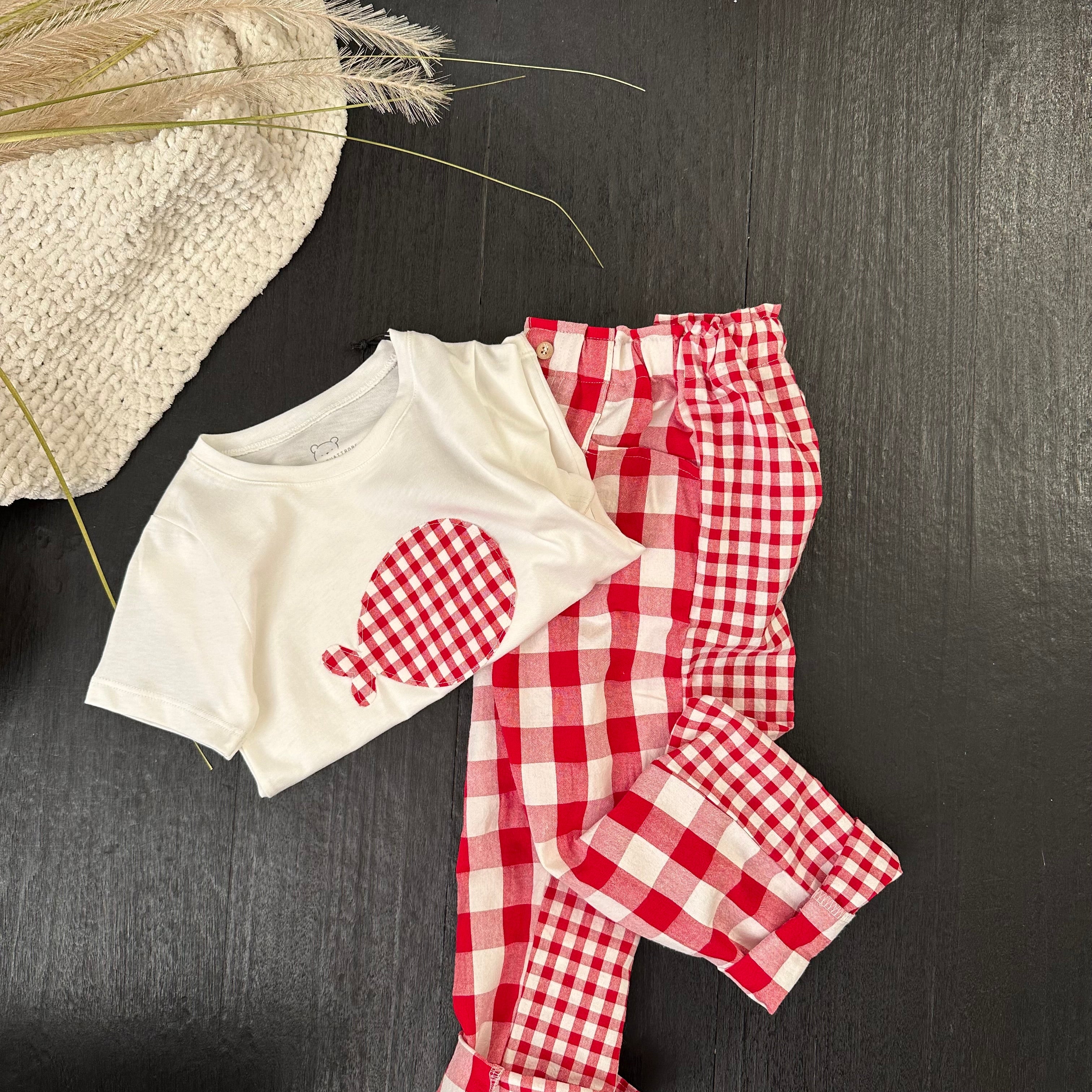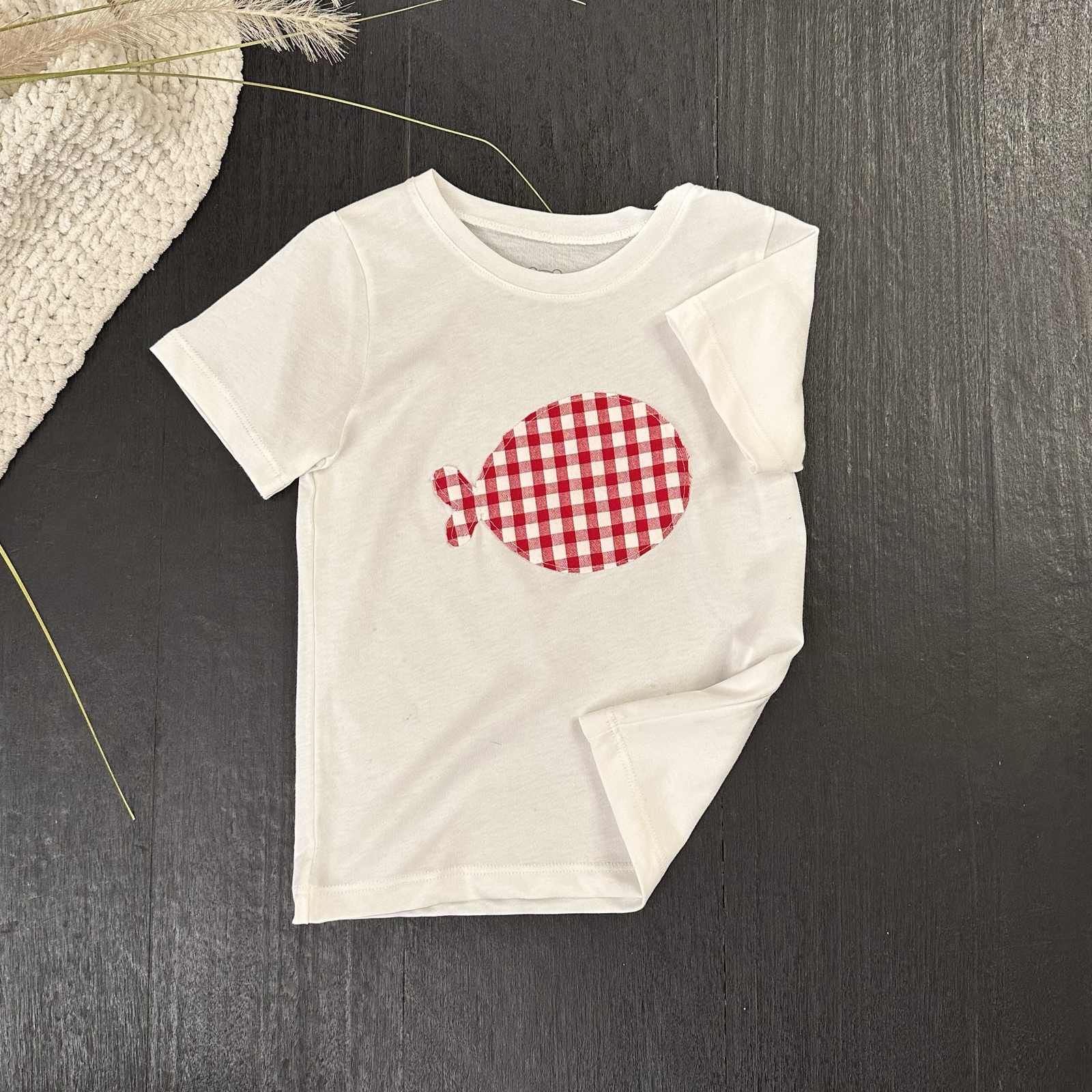 Morbida, fresca e perfetta per ogni occasione. Questa t-shirt in jersey di cotone si distingue per il delicato pesciolino in Vichy amarena applicato sul davanti, un dettaglio che aggiunge un tocco di originalità e raffinatezza. Un capo versatile, ideale per look casual con un pizzico di stile in più