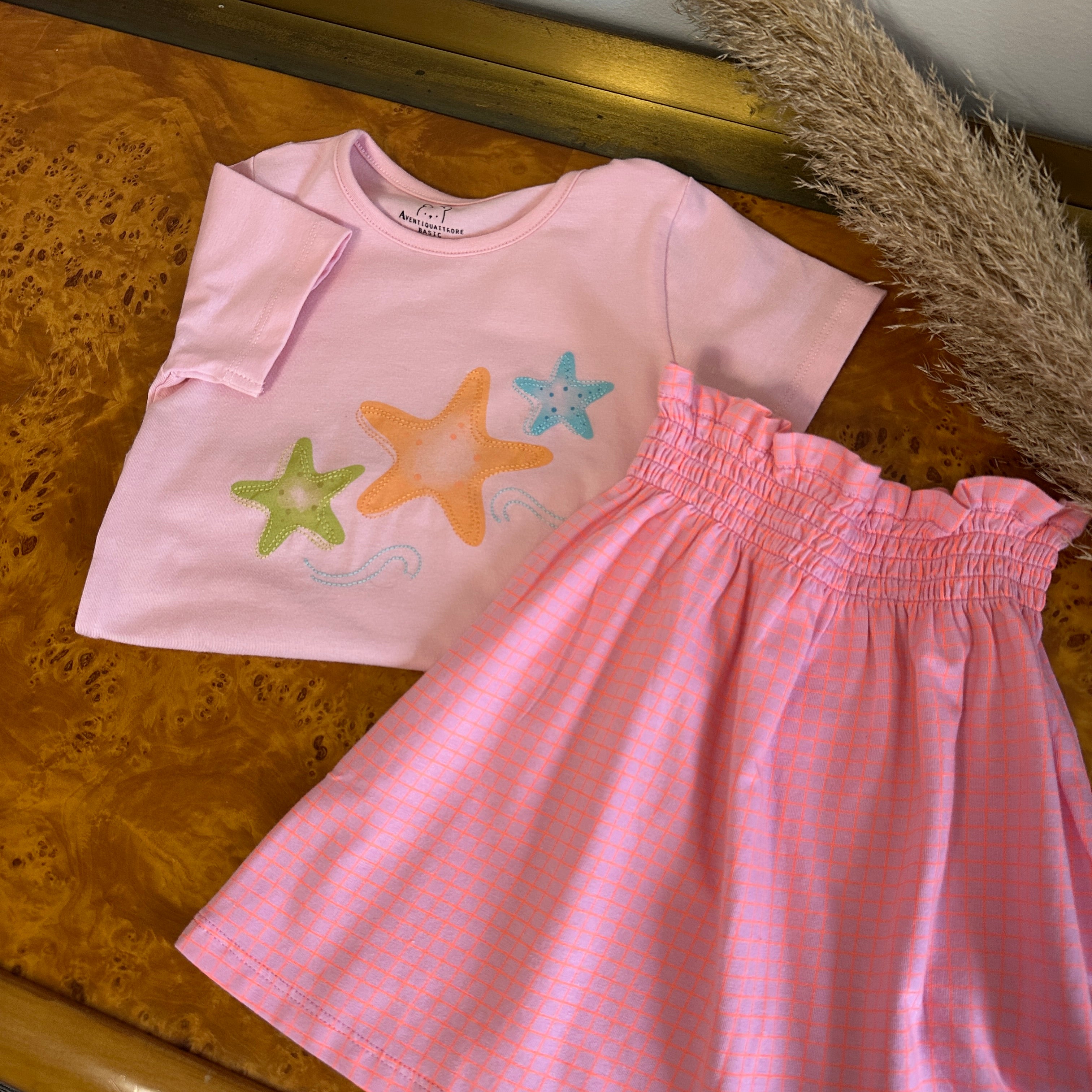 Ispirazione marina e morbidezza senza paragoni: questa t-shirt in jersey di cotone conquista con il suo delicato disegno di stelle marine, perfetto per evocare l’estate e il profumo del mare. Il tessuto leggero e traspirante la rende ideale per le giornate calde, mentre il taglio comodo la rende facile da indossare e da abbinare. Un capo fresco, giocoso e pieno di fantasia, perfetto per le piccole amanti della natura e del mare.