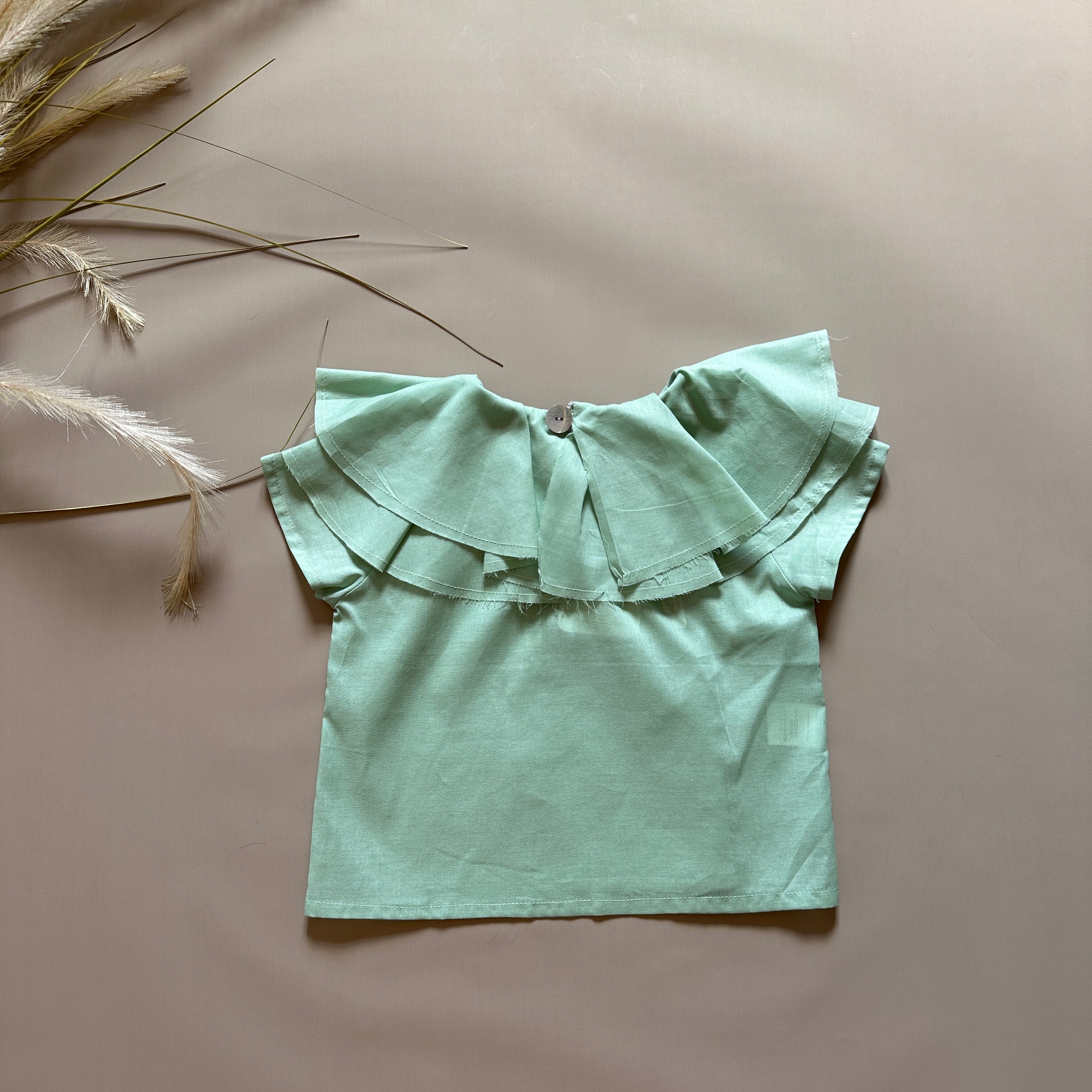 Fresco, leggero e raffinato. Questo top in cotone color menta è perfetto per ogni occasione. Il colletto a più strati aggiunge movimento ed eleganza, per un look delicato e senza tempo.