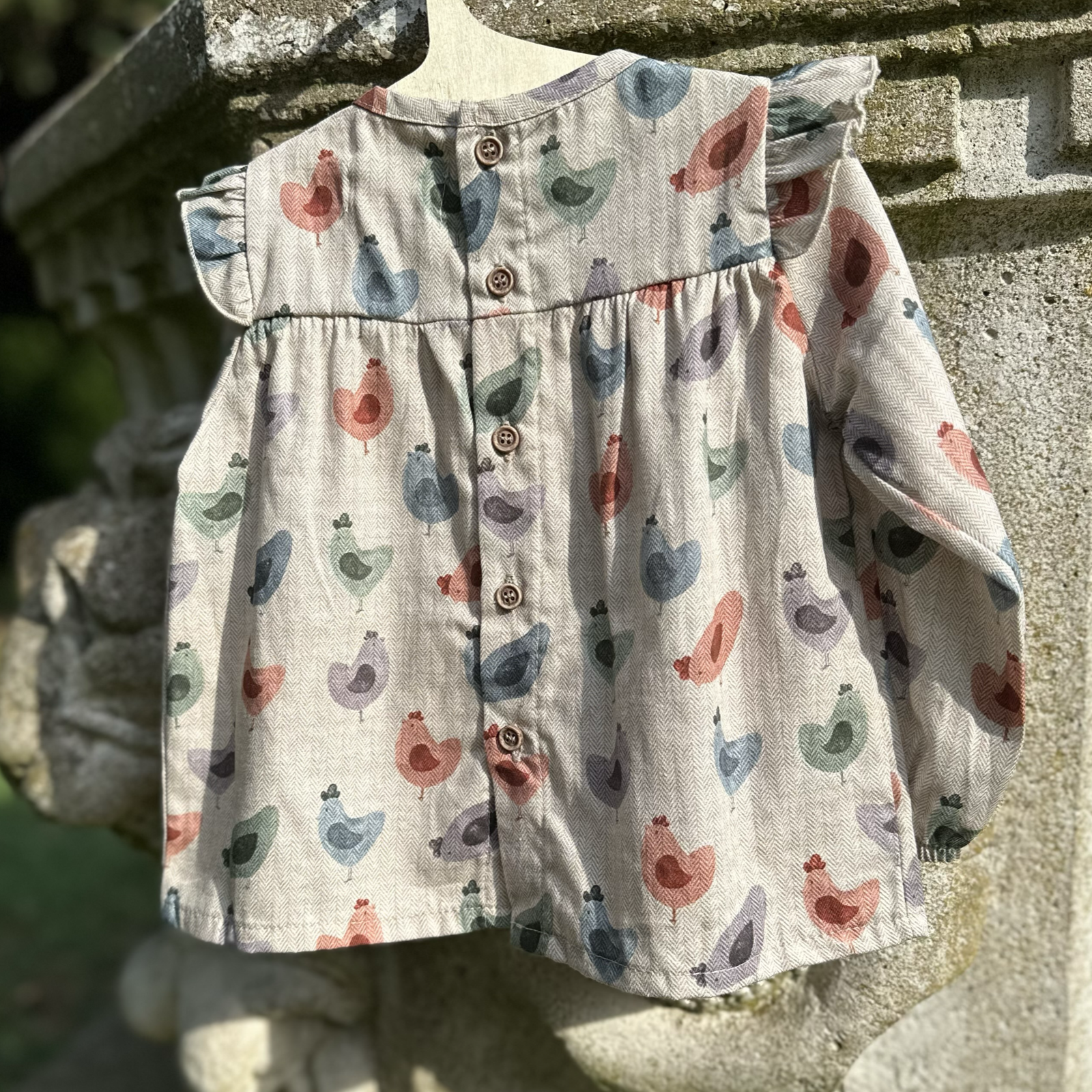 Blusa in morbido cotone, caratterizzata da eleganti ruches e bottoni decorativi sul retro. La stampa esclusiva di galline colorate aggiunge un tocco vivace e originale, ideale per rendere ogni giorno speciale.
