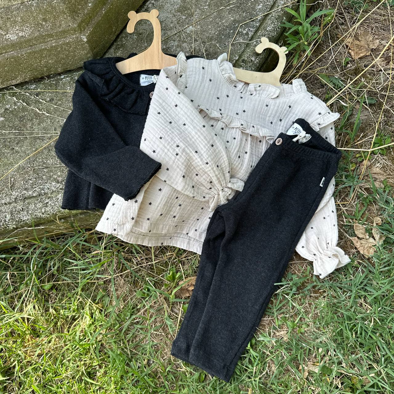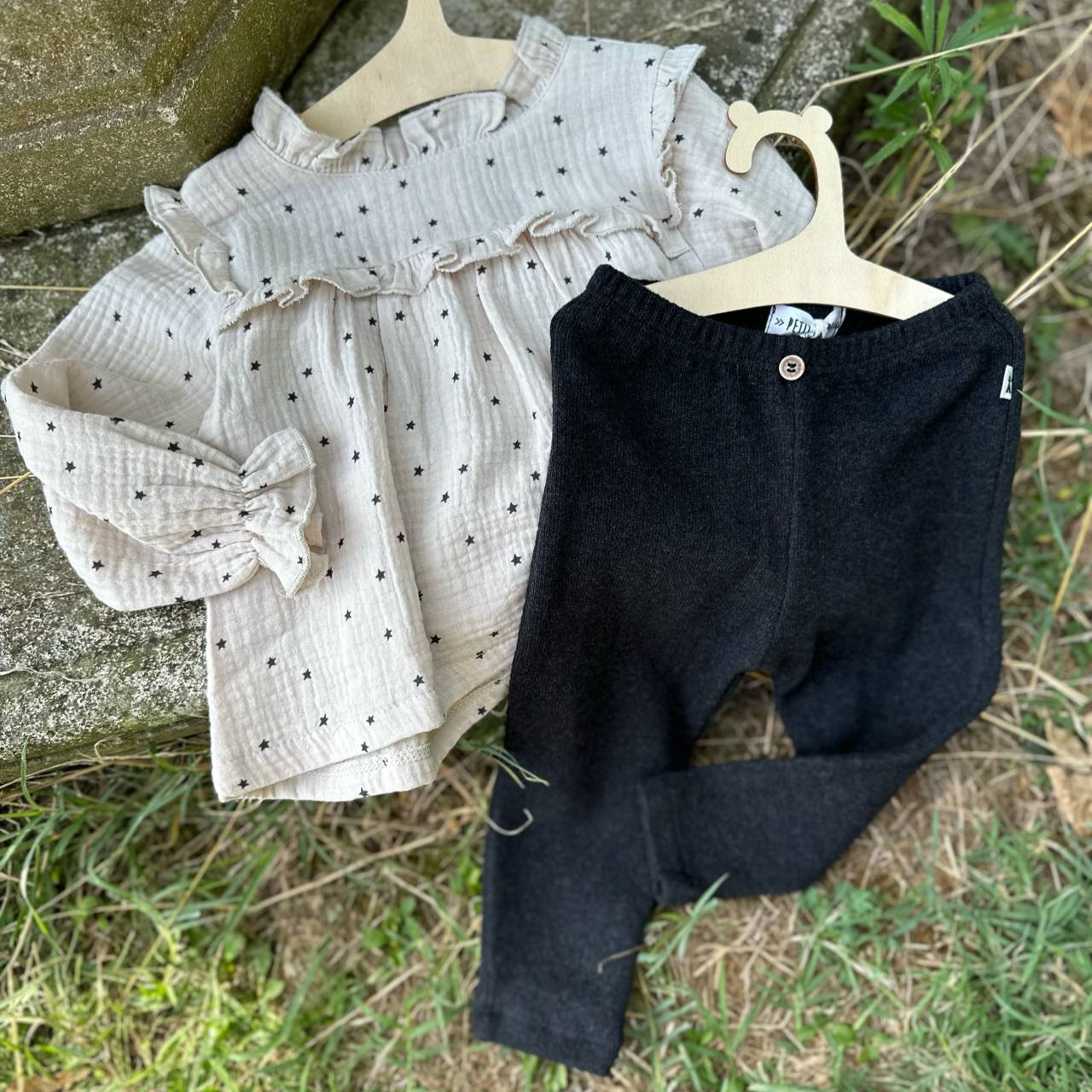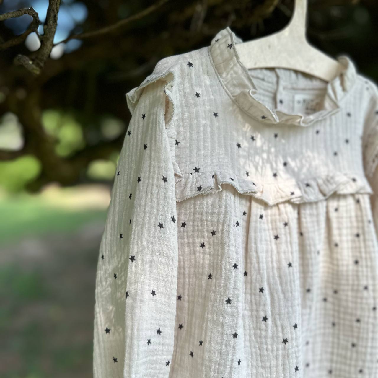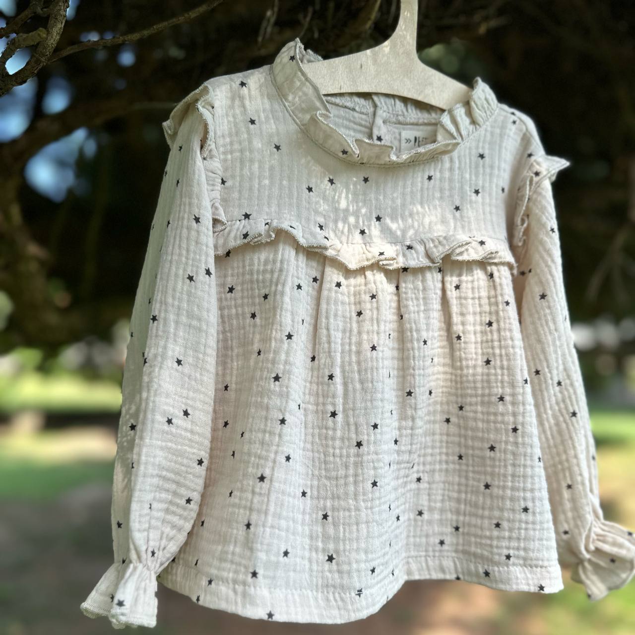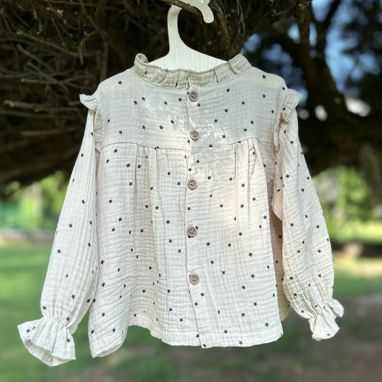Blusa in morbidissimo cotone con ruches e una stampa di stelle scintillanti. I bottoni sul retro non solo aggiungono un dettaglio elegante, ma rendono questo capo unico nel suo genere, perfetto per chi ama un tocco di originalità e comfort.