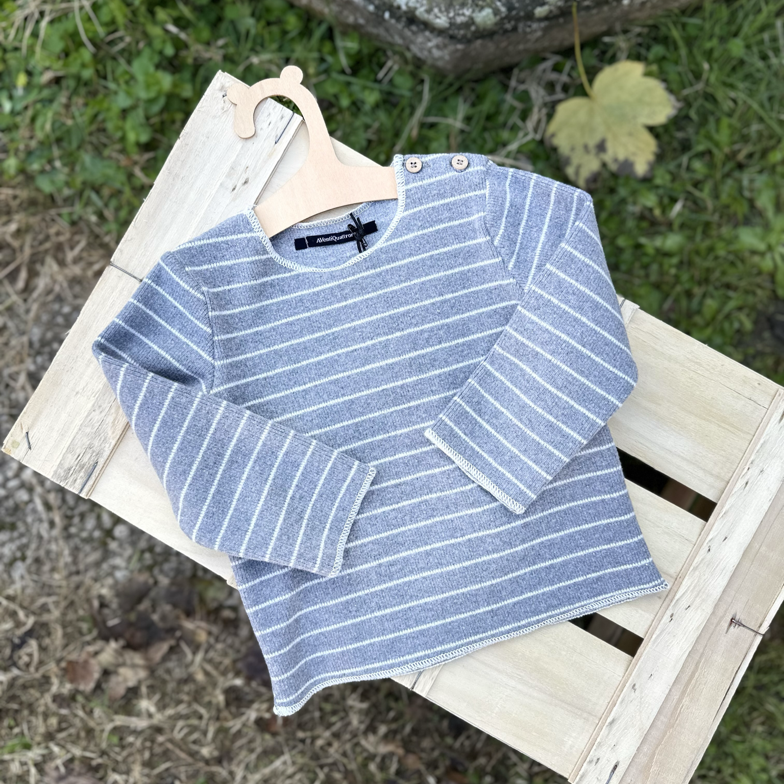 Questa t-shirt a maniche lunghe è realizzata in un morbidissimo caldo cotone con una elegante lavorazione a costina rigata grigia. Ideale per mantenere i piccoli al caldo durante le giornate più fresche, offre comfort e stile in ogni occasione casual.