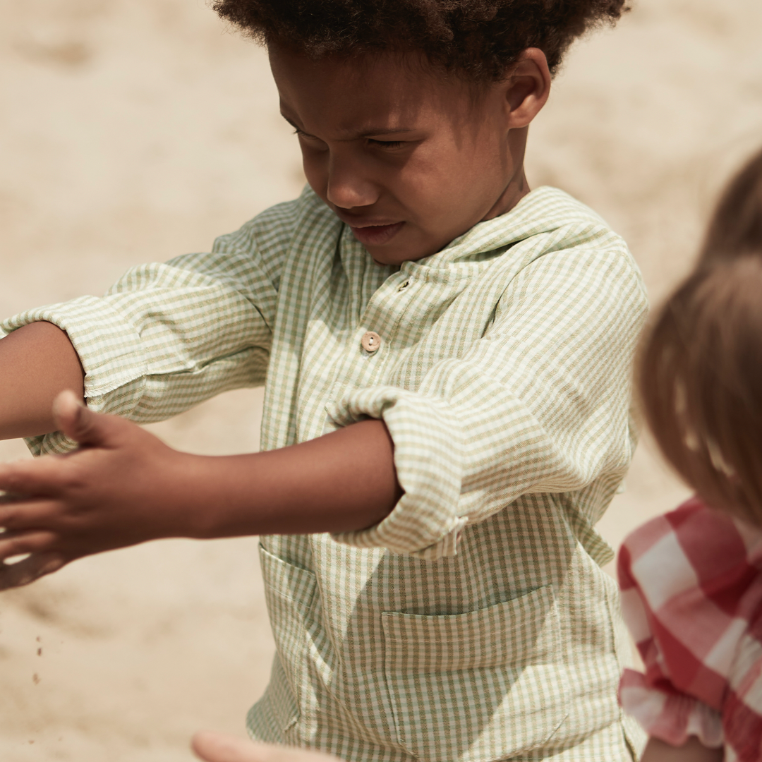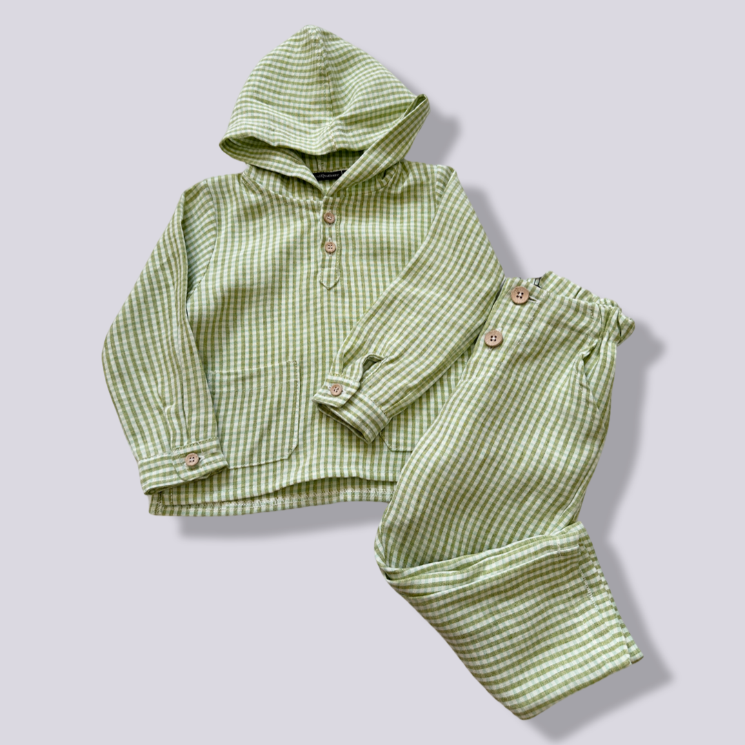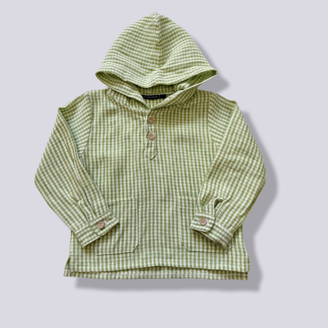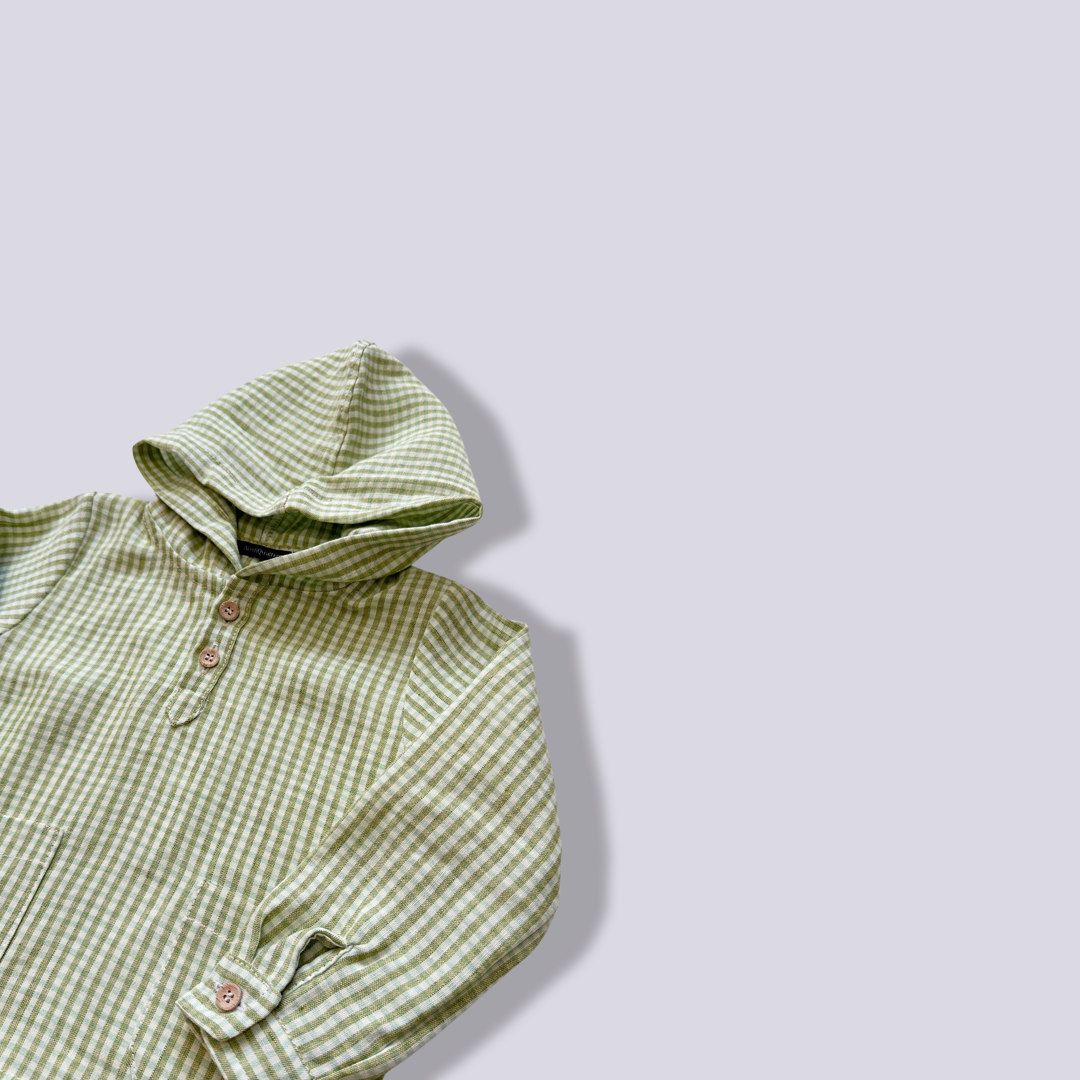 Camicia con cappuccio in lino, con un attraente motivo a quadretti verdi. Questo capo unisce la leggerezza e la traspirabilità del lino a un design casual e contemporaneo, grazie all'aggiunta del cappuccio. Perfetta per un look informale ma curato, è ideale per le giornate di mezza stagione o per le fresche serate estive.
