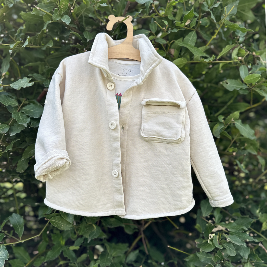 Camicia felpa beige: il perfetto equilibrio tra comfort e stile, con tessuti morbidi e design accattivante per piccoli esploratori alla moda."