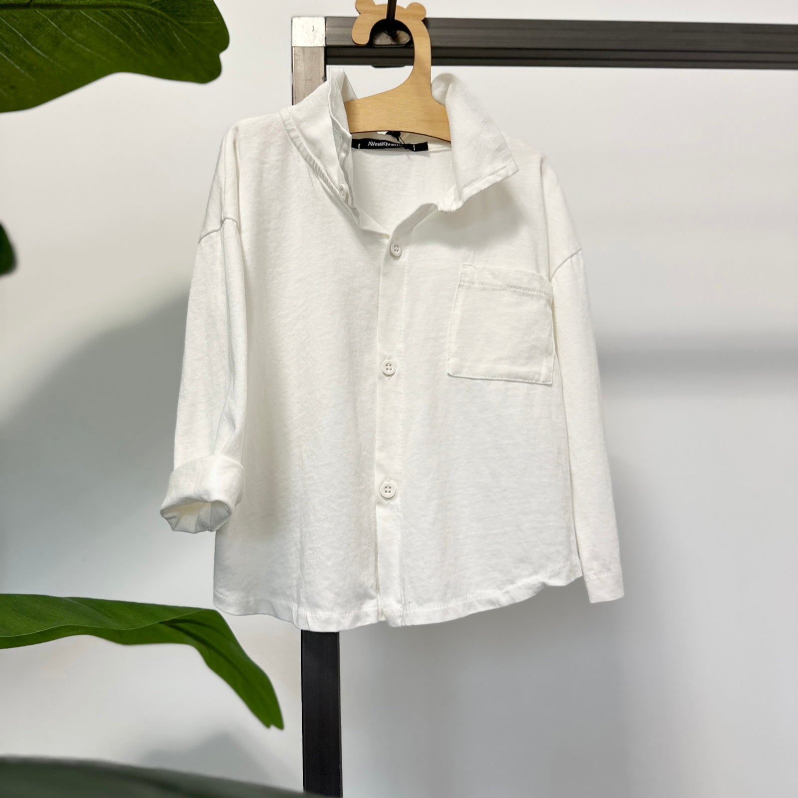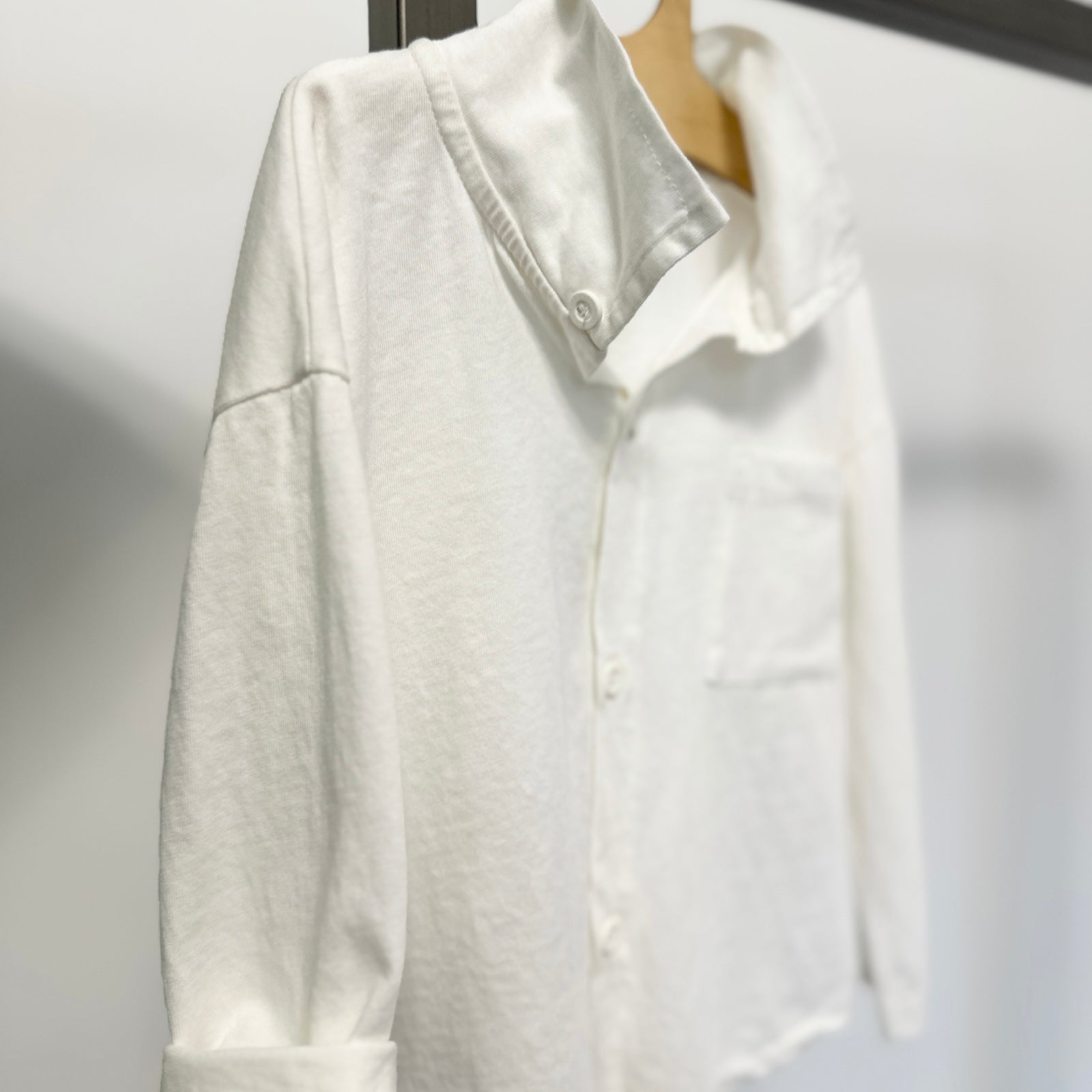 Camicia in jersey latte, caratterizzata da un tessuto morbido e confortevole. Design classico con colletto, chiusura frontale a bottoni e maniche lunghe, perfetta per occasioni formali o per un look quotidiano elegante.