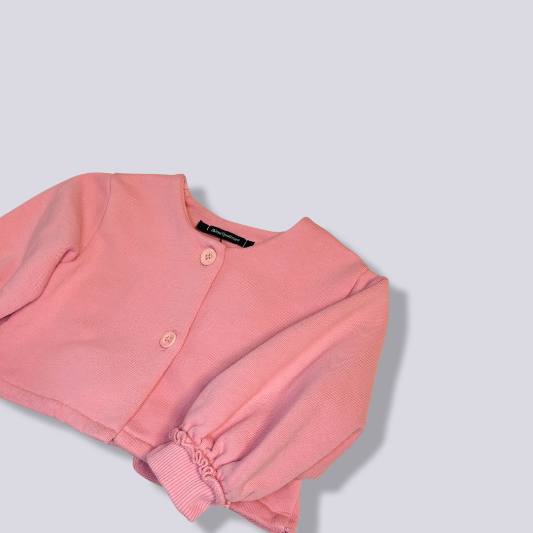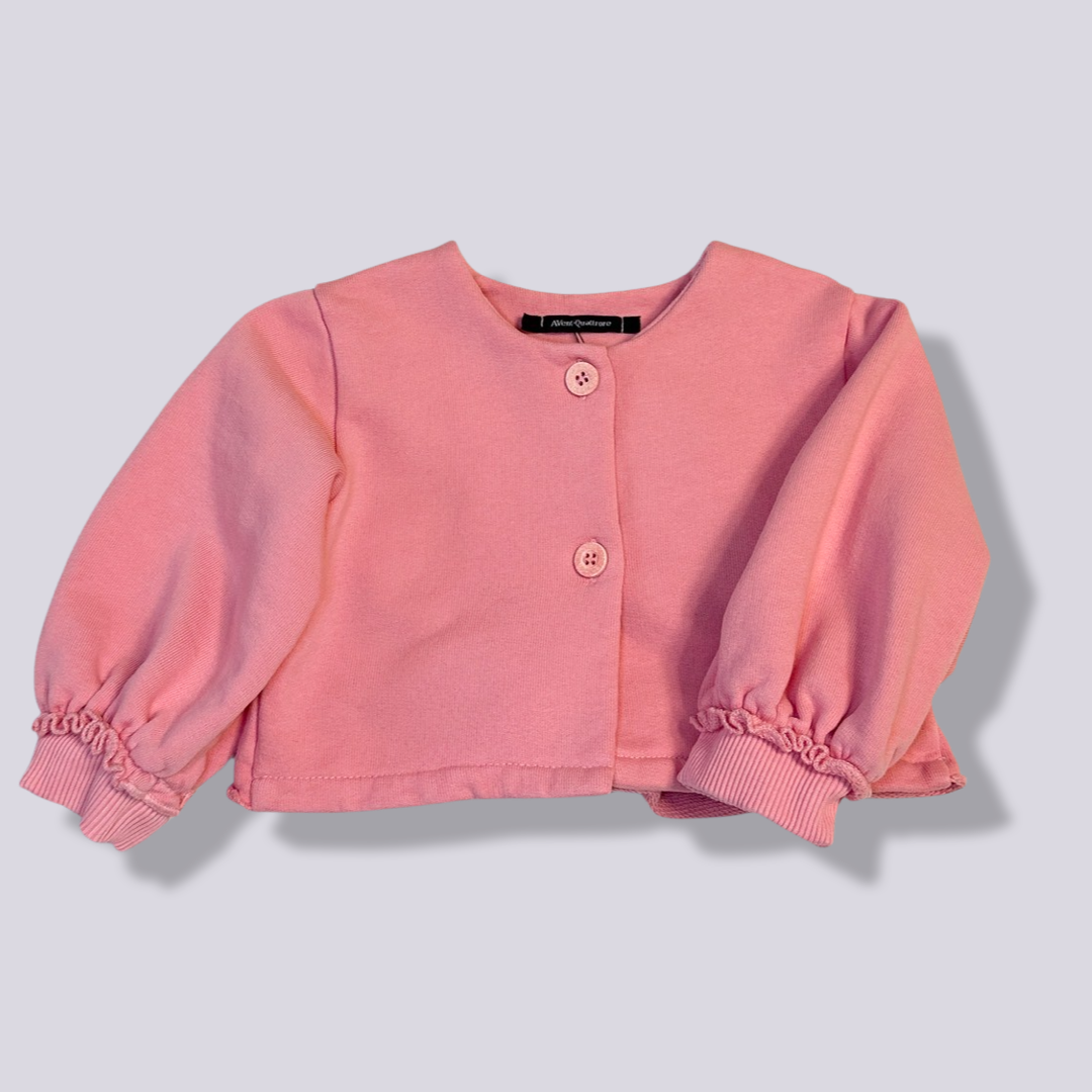 La felpa cardigan color fragola  è un capo dolce e colorato, perfetto per aggiungere un tocco di vivacità ai look più quotidiani. Realizzata in morbida felpa, questa giacca offre calore e comfort, rendendola ideale per le giornate primaverili o estive . Il colore fragola, vivace e accattivante, è facile da abbinare e piace molto alle piccole.Versatile e pratico, il cardigan in felpa color fragola si presta a essere indossato sopra abiti, magliette o camicie, aggiungendo un tocco di calore e stile senza rinunciare alla comodità.
