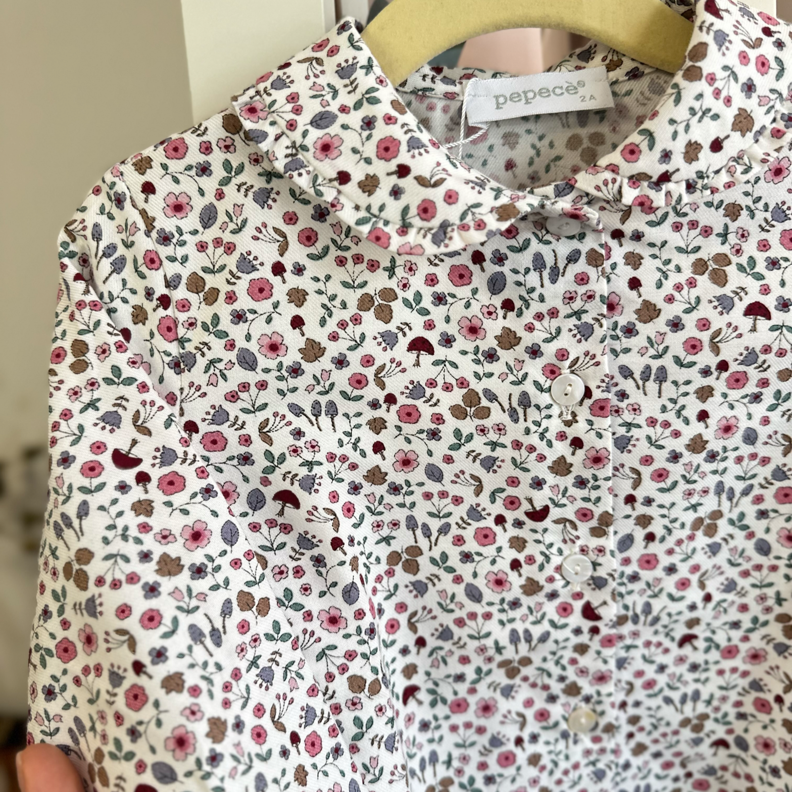 Camicia fantasia autunnale con funghetti, foglie e fiorellini